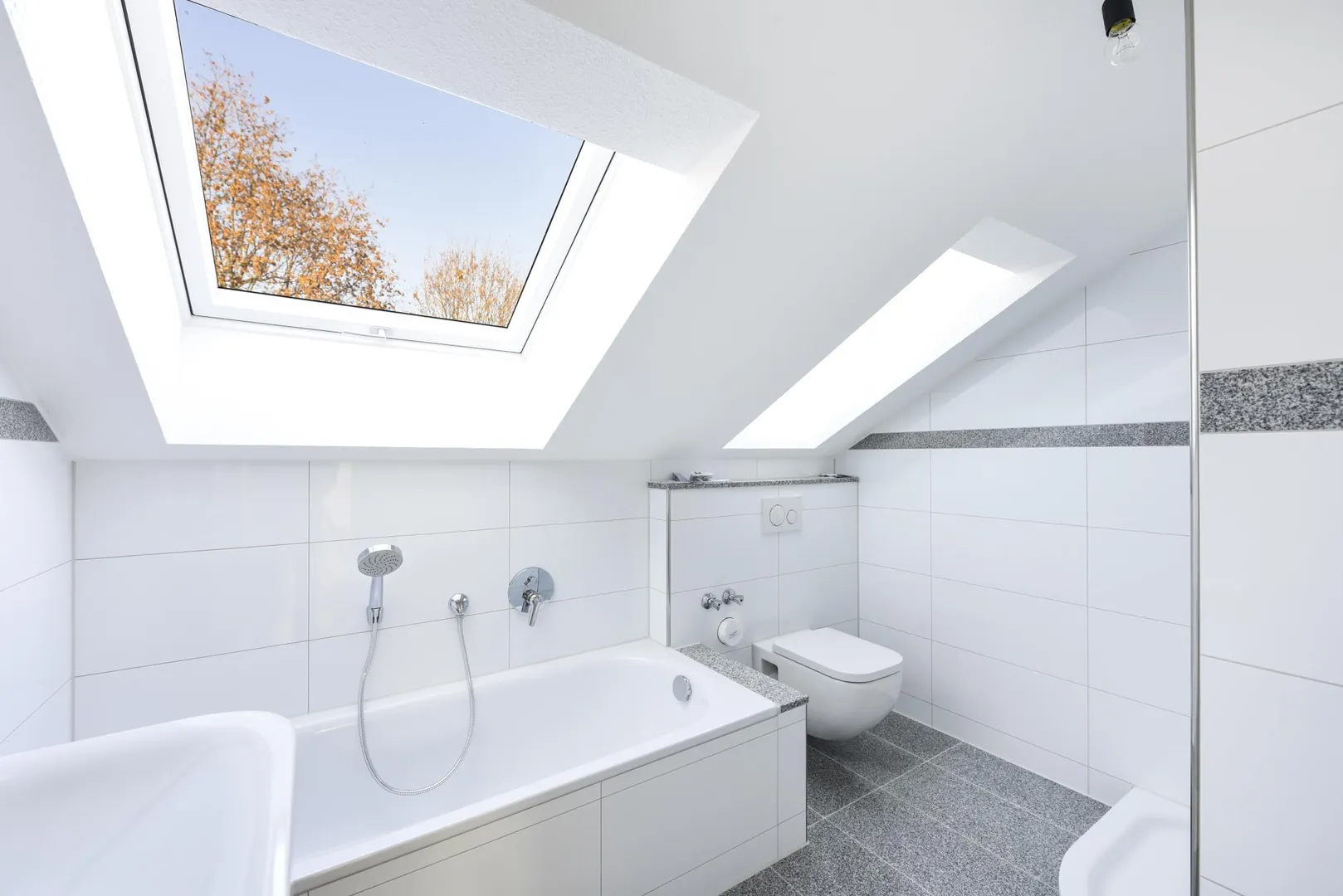Das raumhoch geflieste Badezimmer mit zwei Fenstern ist ausgestattet mit einer Badewanne, einer Dusche, einem WC sowie einem Handtuch-Heizkörper.