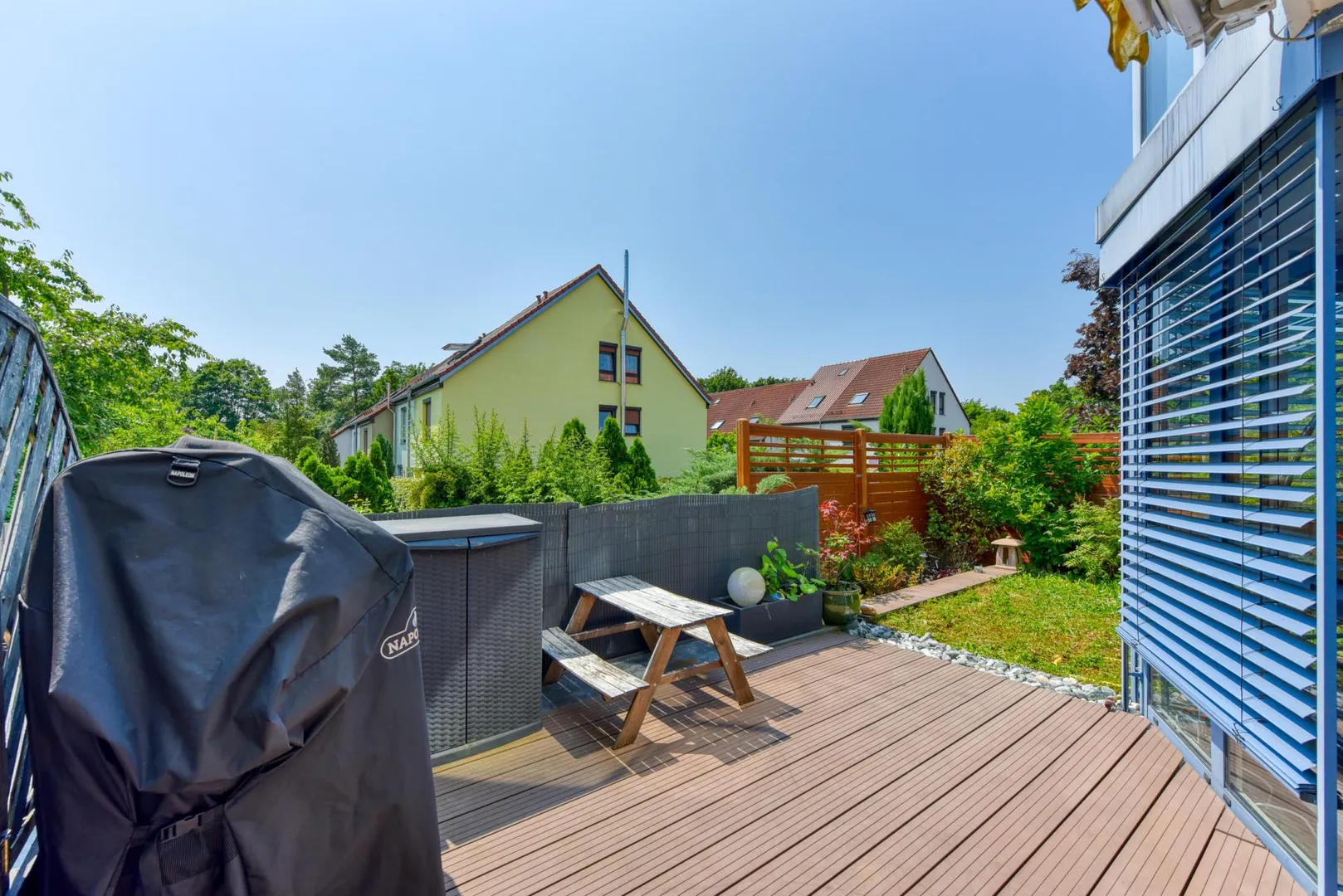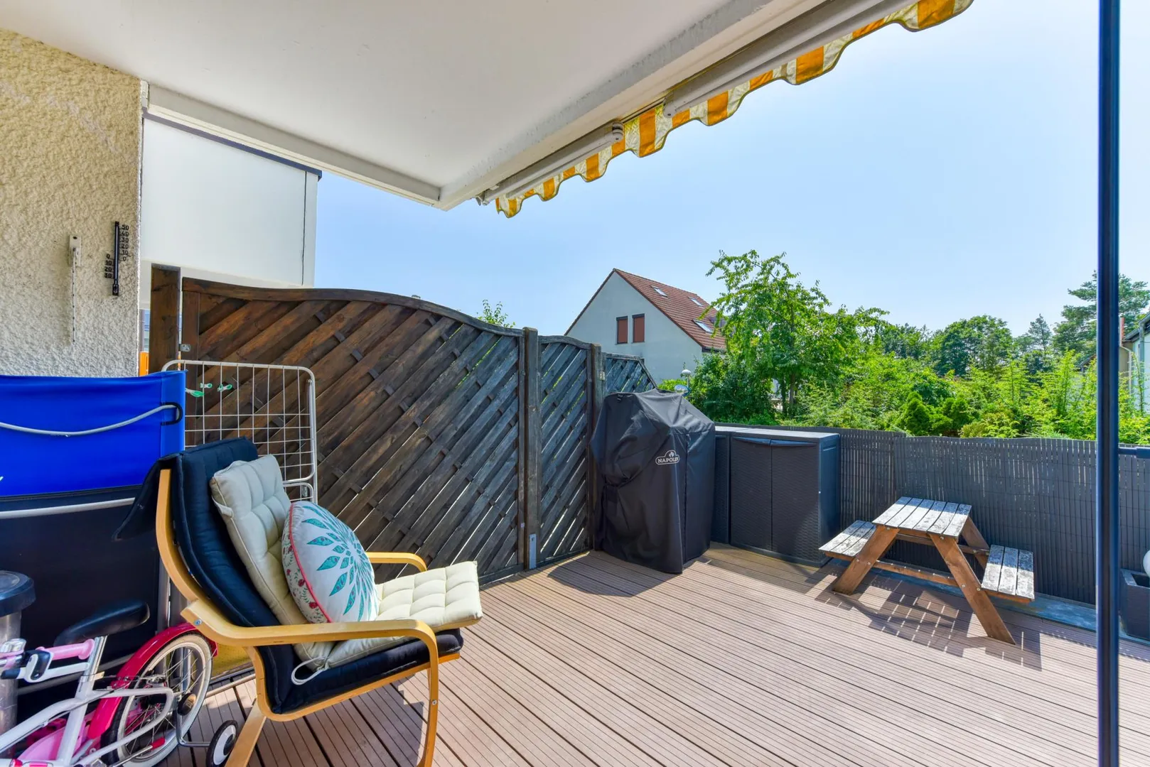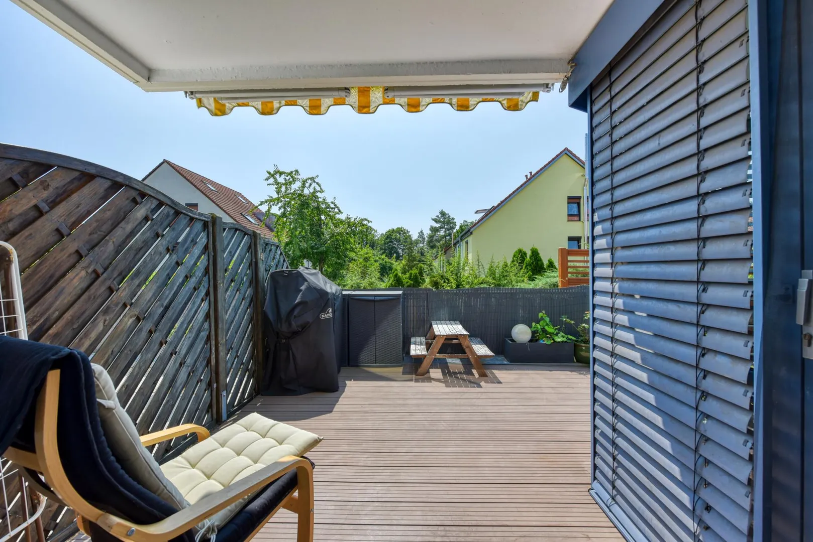 Die teilüberdachte Terrasse ist ca. 14 m² groß und ist mit einer elektrischen Markise ausgestattet.