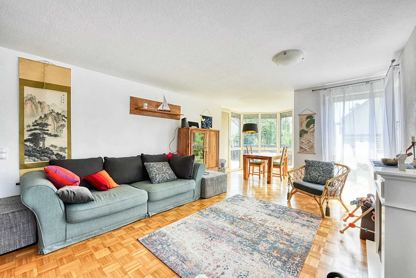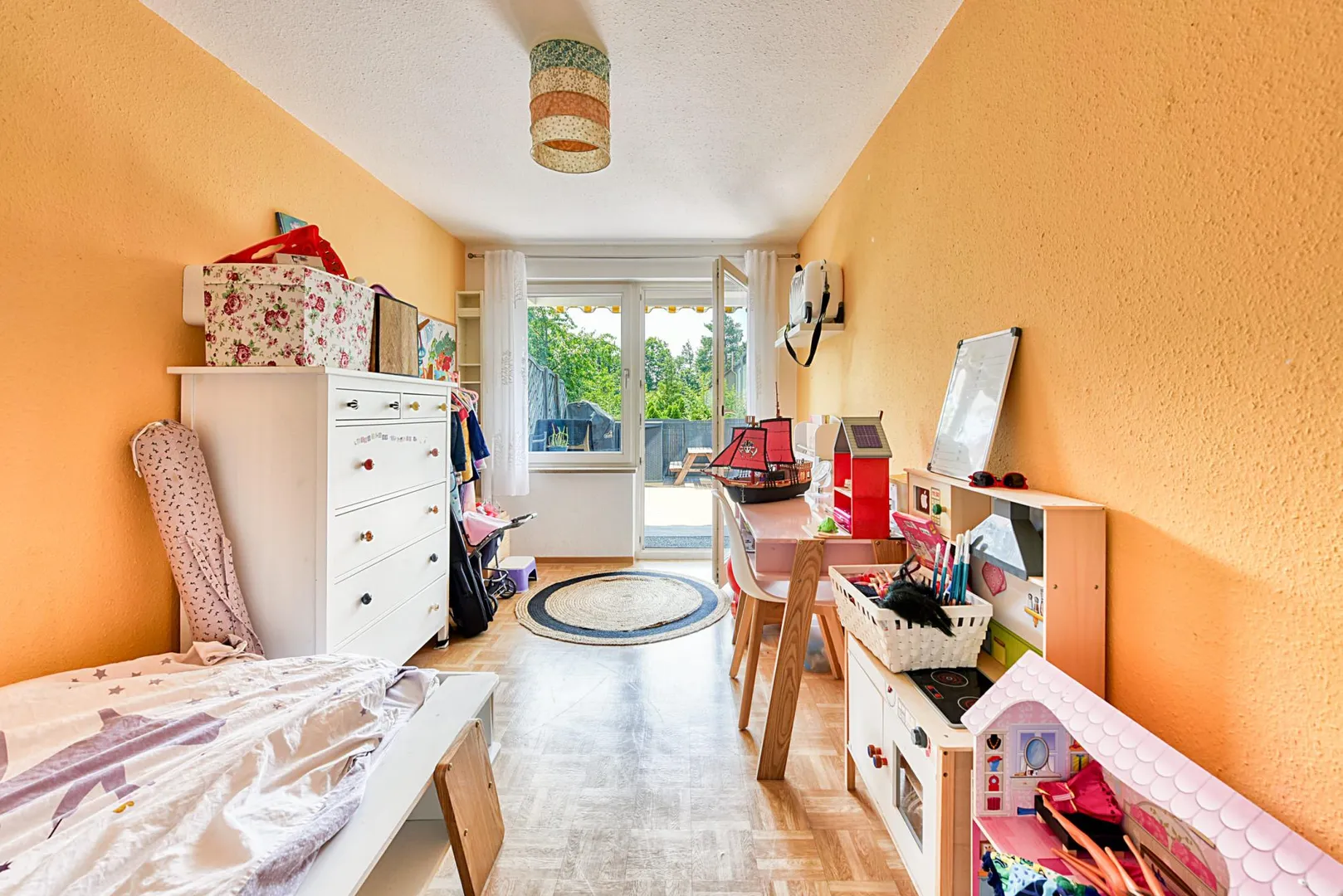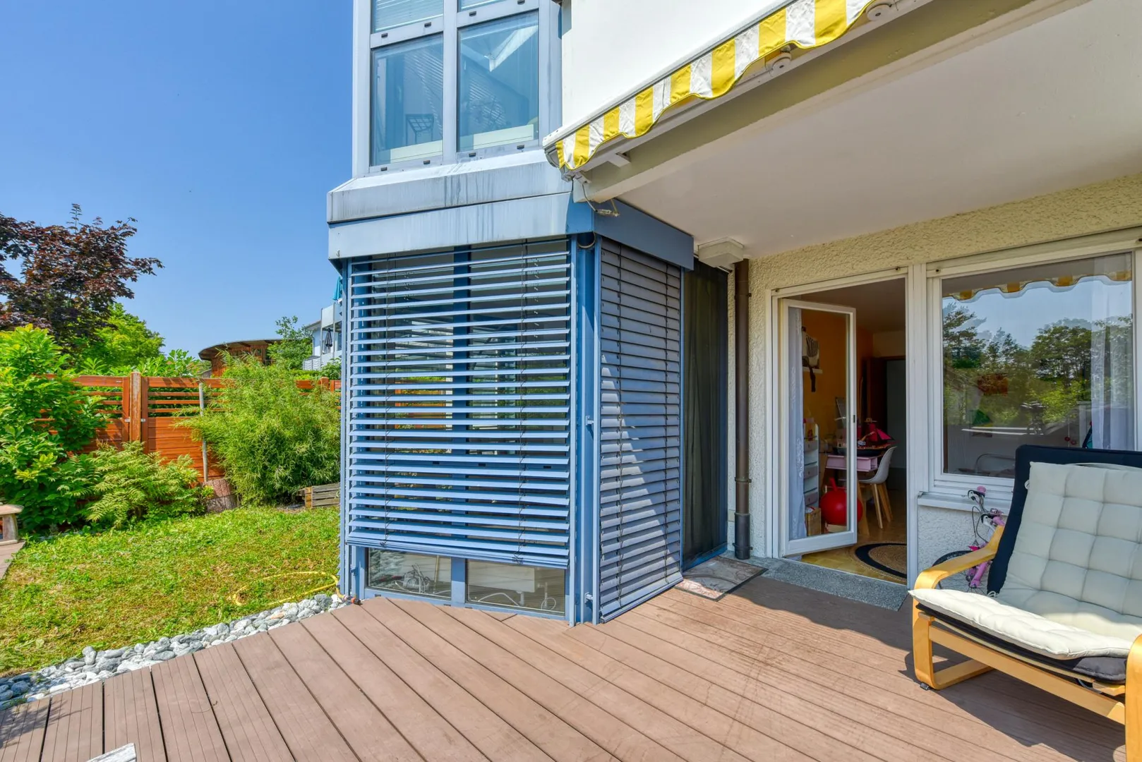 Diese helle und sonnige 4-Zimmer-Wohnung mit Terrasse und Grünfläche befindet sich im Erdgeschoss.