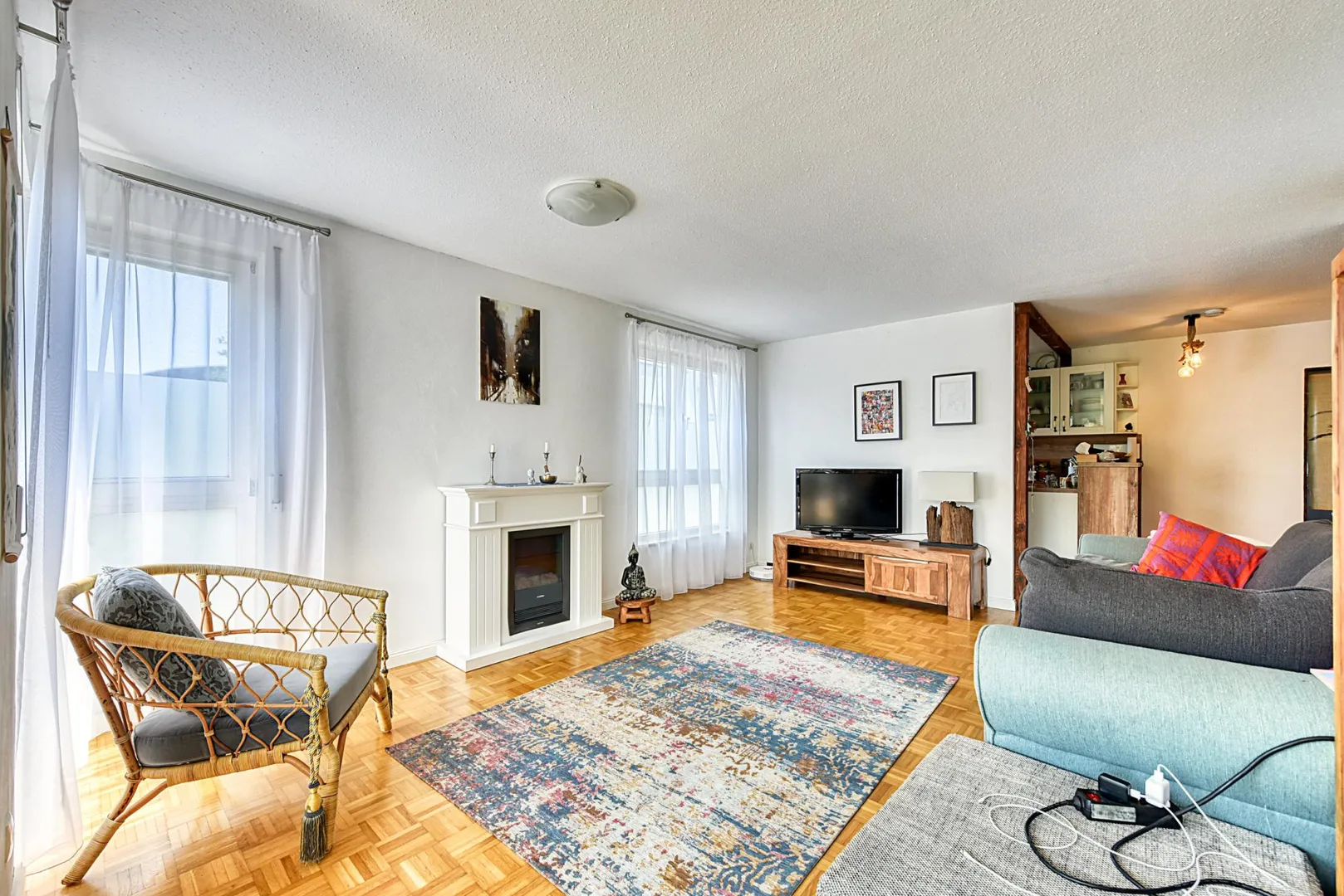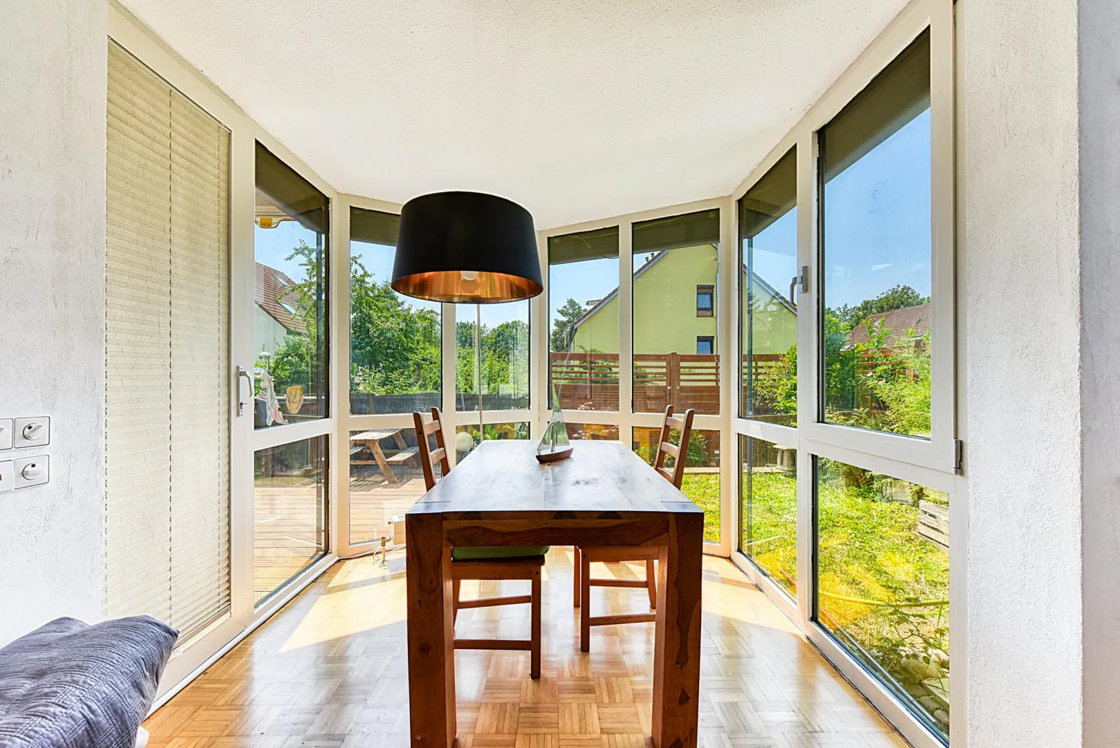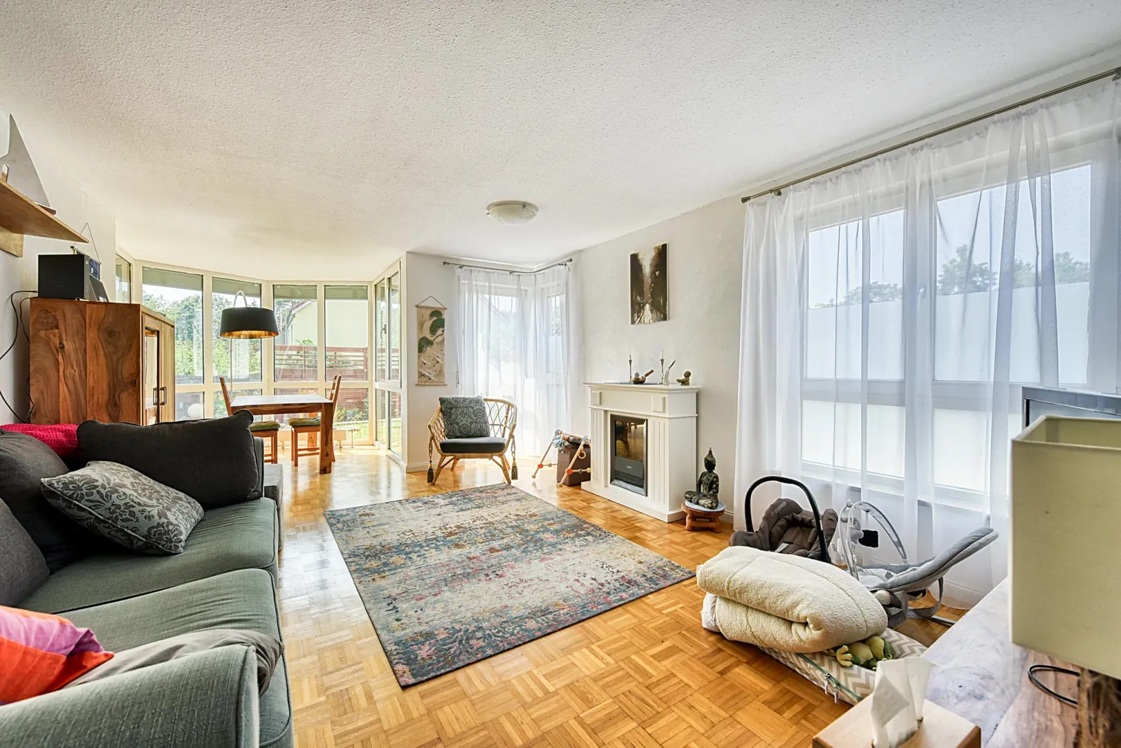 Diese helle und sonnige 4-Zimmer-Wohnung mit Terrasse und Grünfläche befindet sich im Erdgeschoss eines 9-Familienhauses.