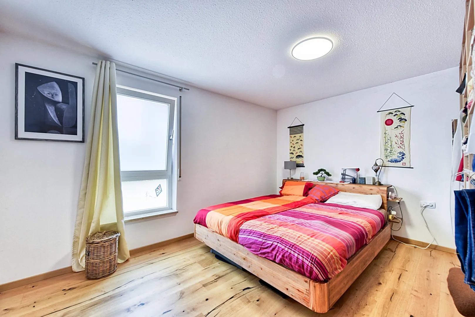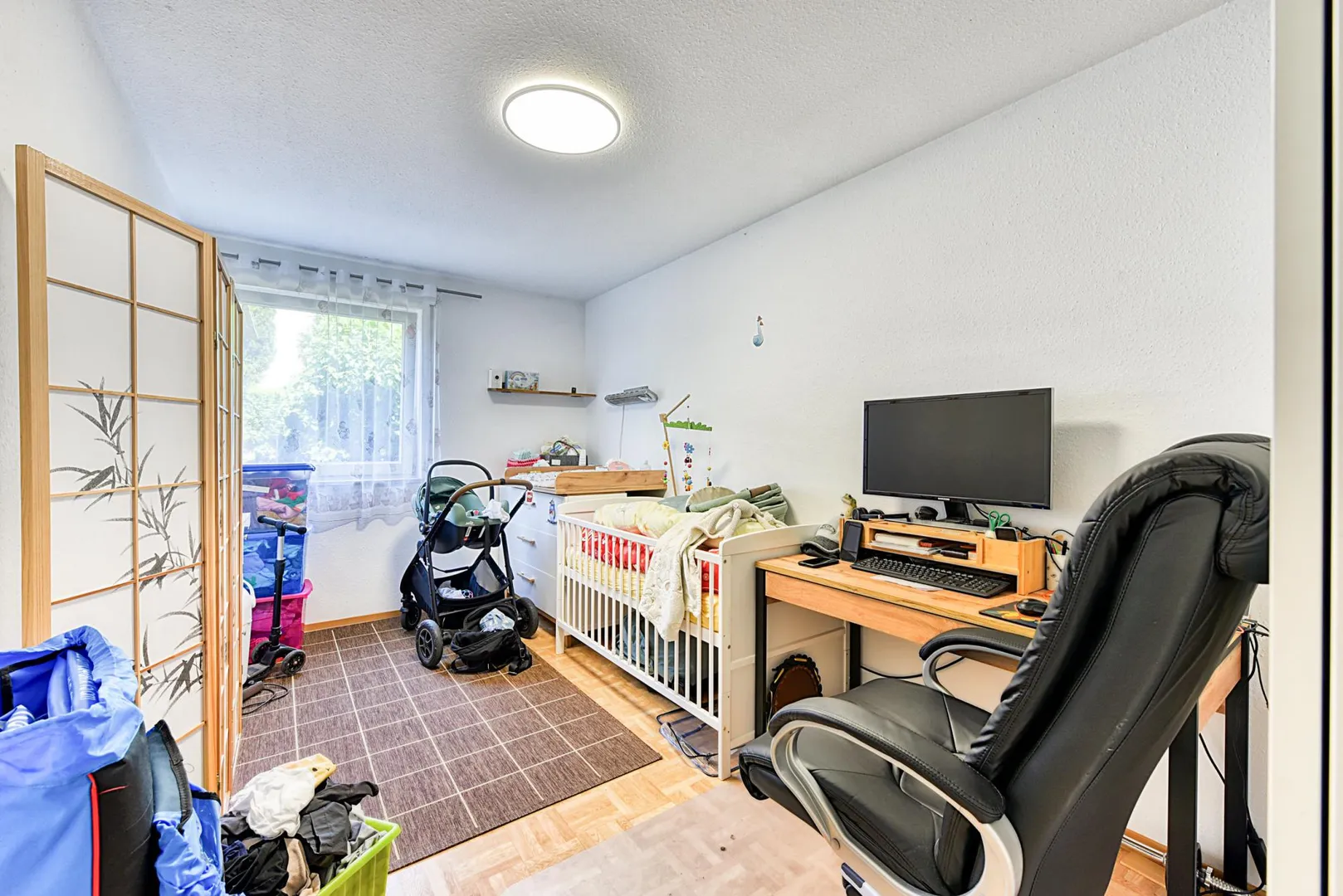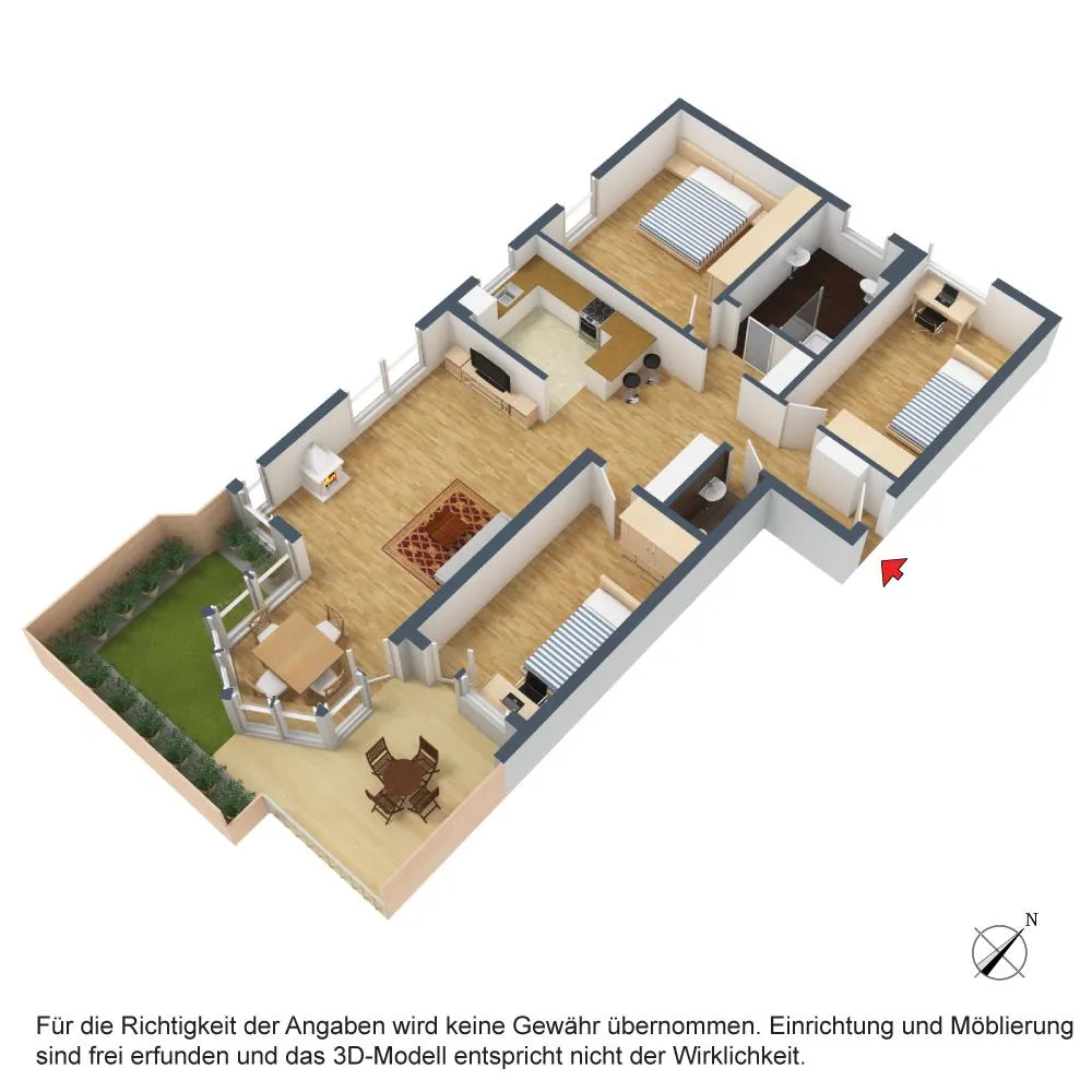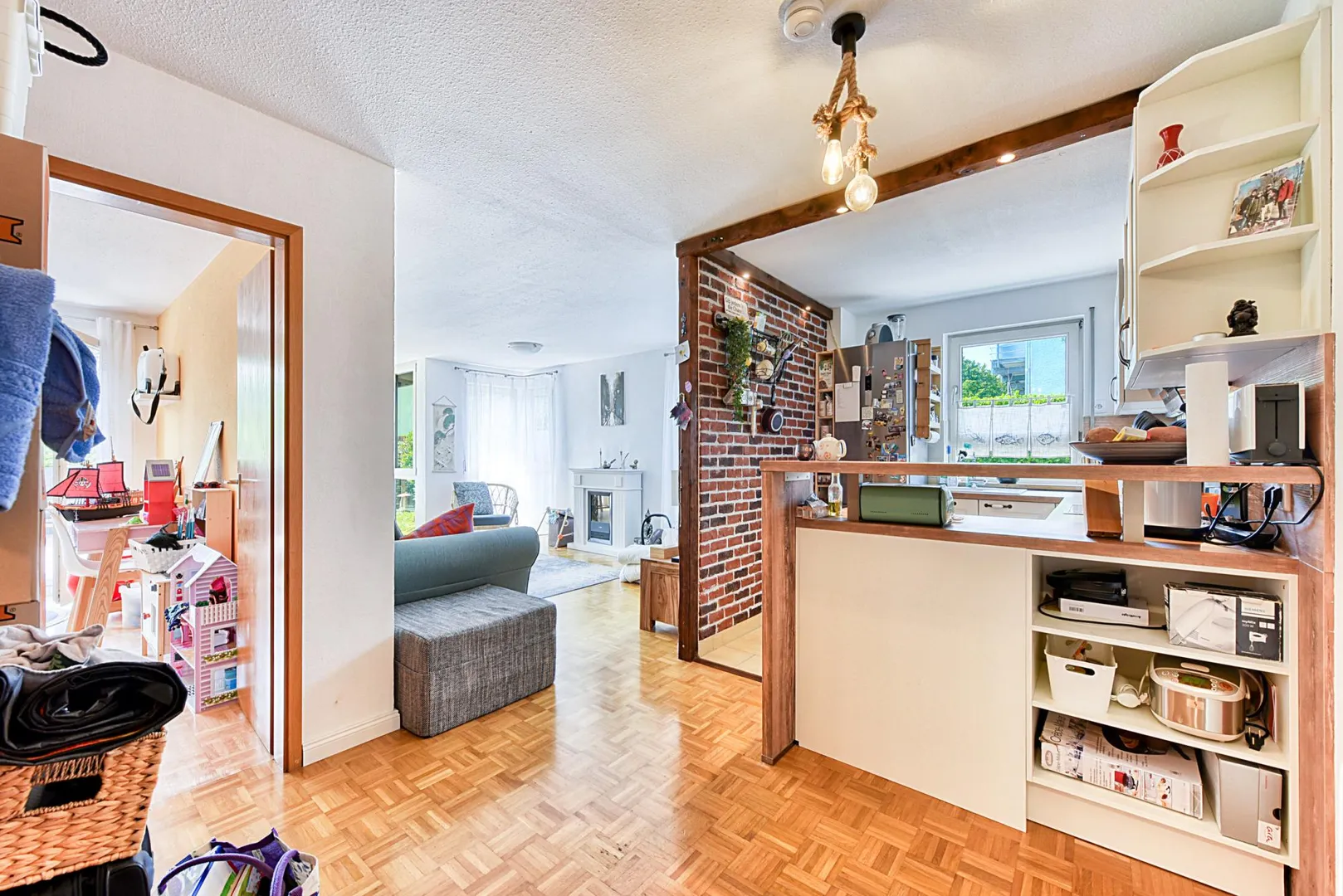 Die Wohnung ist offen gestaltet. Der Flur-, Wohn-, Ess- und Küchenbereich ist offen. Die Terrasse und die Grünfläche sind vom Wohn-/Essbereich sowie vom Kinderzimmer begehbar und sind nach Süden ausgerichtet.