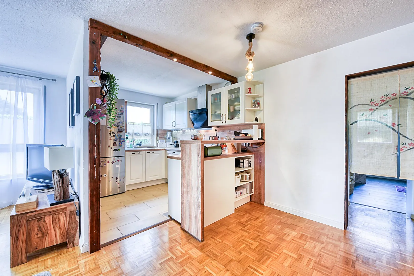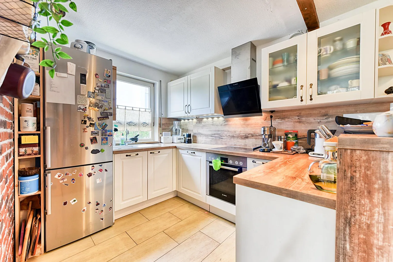 Die Küche wurde ca. 2015 geöffnet und mit einer Einbauküche ausgestattet. Die Küche verfügt über einen Abzug nach außen. Der Küchenboden ist gefliest.