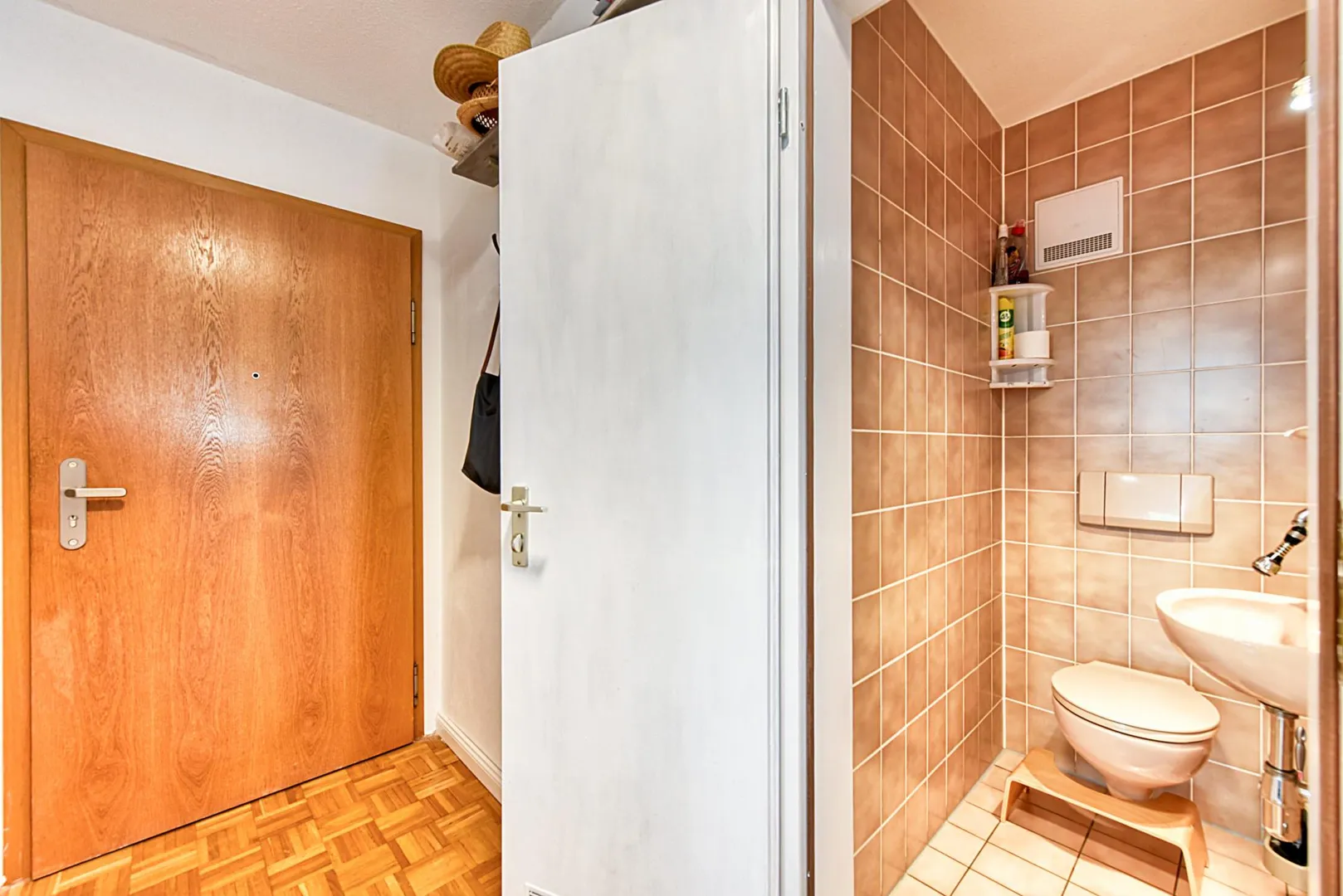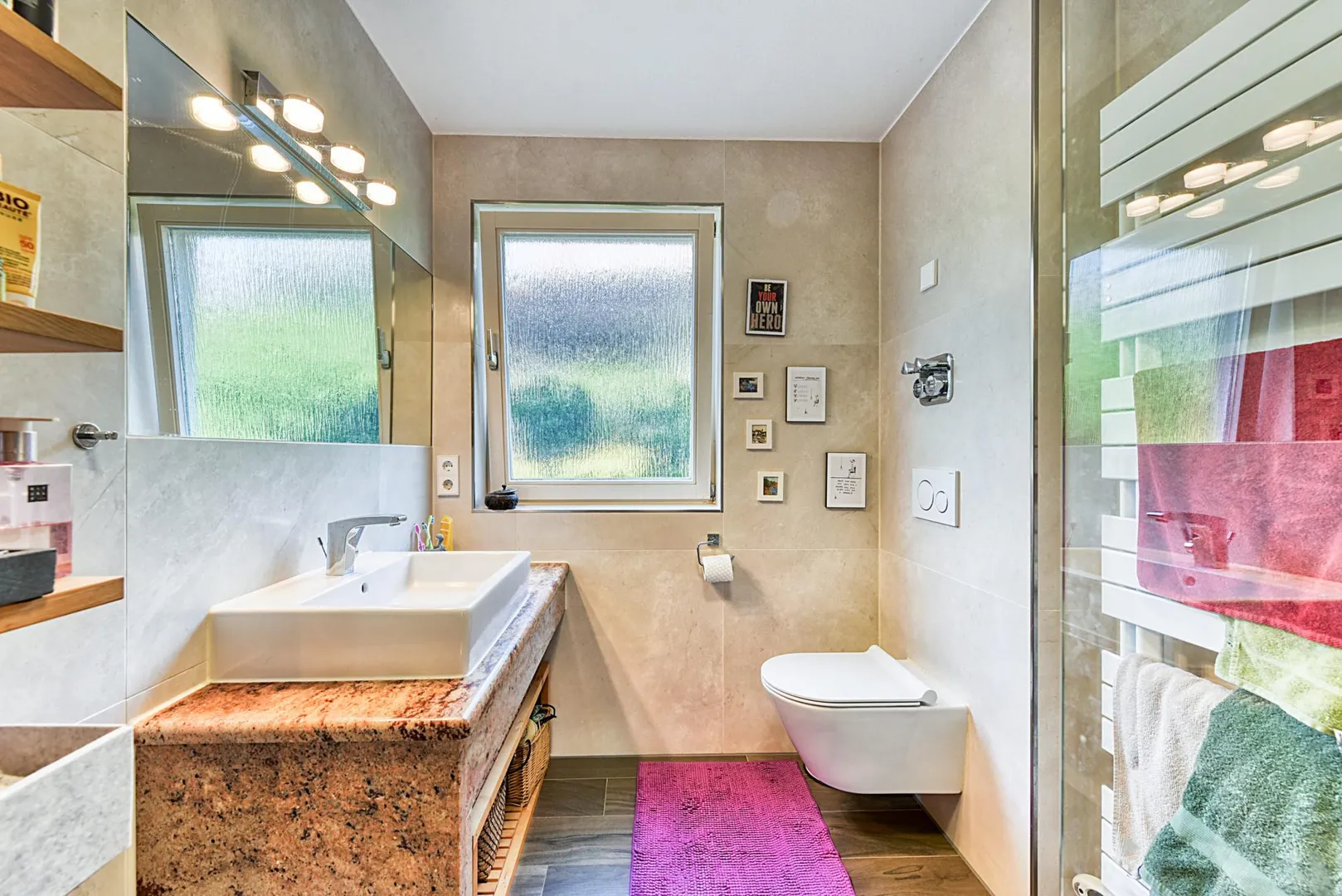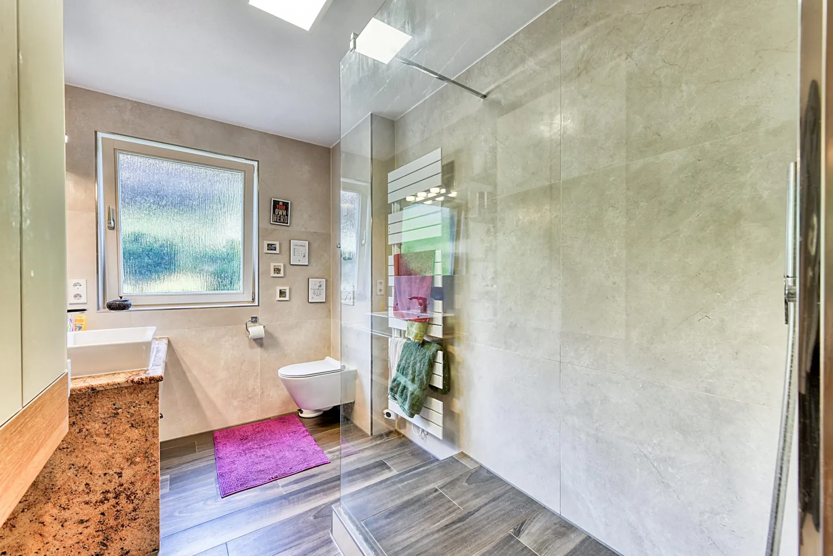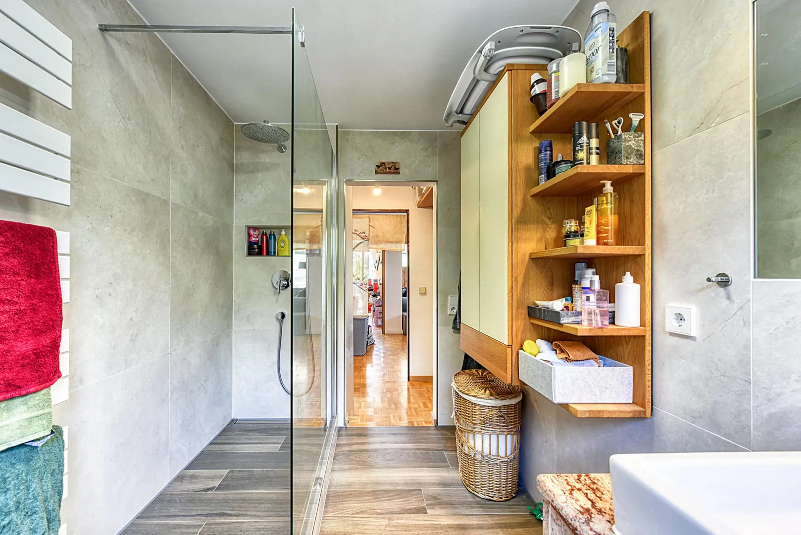 Das raumhoch geflieste Badezimmer wurde 2017 modernisiert und verfügt über ein Fenster, einen Fliesenboden, eine Dusche, ein WC sowie einen Handtuch-Heizkörper. Das zweite WC ist separat.