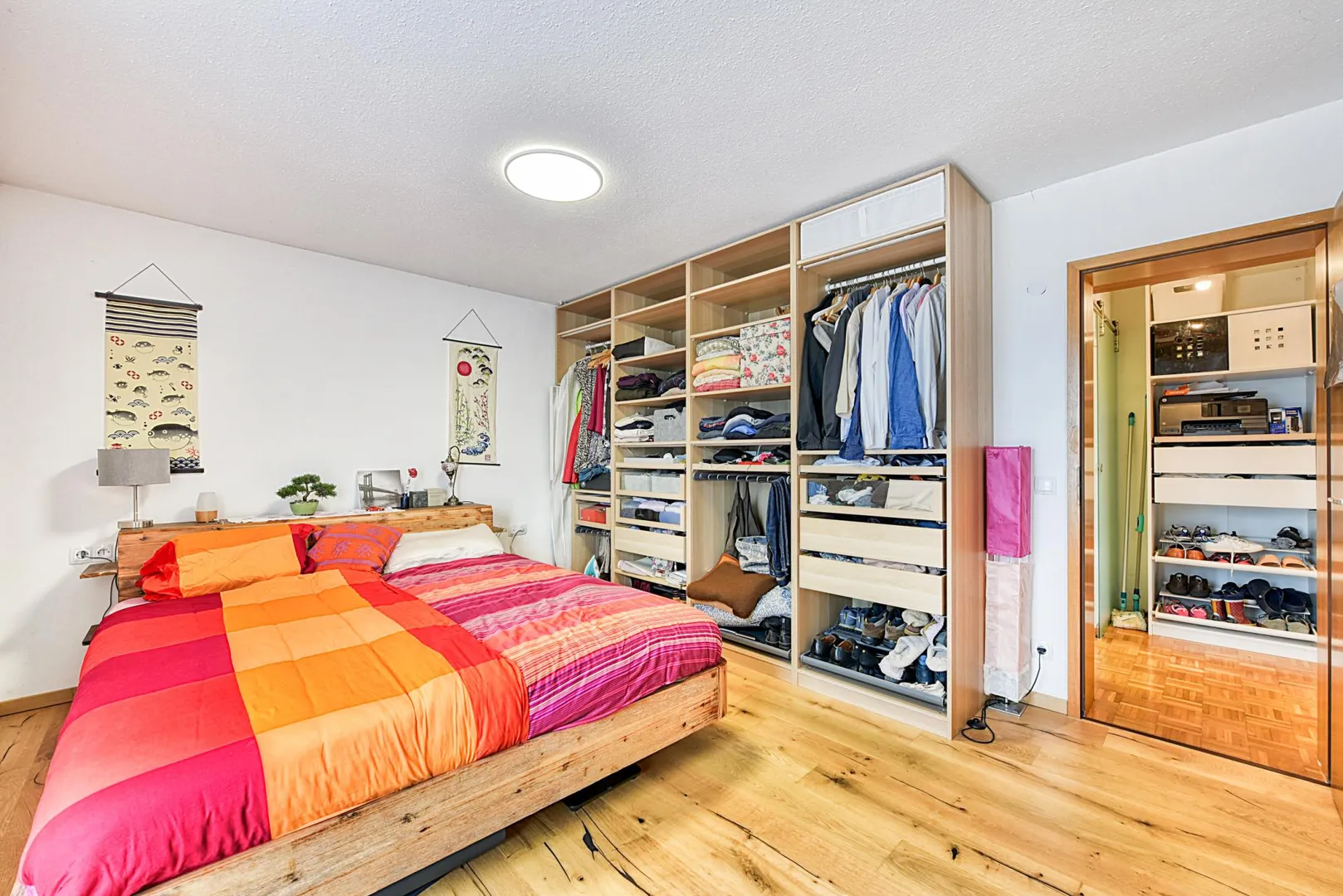 Die Böden im Flur, im Wohn-/Essbereich sowie im Schlafzimmer sind mit Parkett ausgelegt. In den anderen Zimmern ist PVC-Boden verlegt.