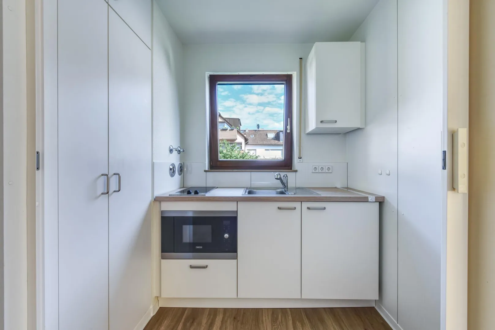 Die neue Einbauküche verfügt über einen Kühlschrank mit Gefrierfach, einen Herd mit 2 Kochplatten, eine Mikrowelle sowie Unter- und Oberschränke. Für die künftige Funktionsfähigkeit der E-Geräte übernimmt der Vermieter keine Haftung.
