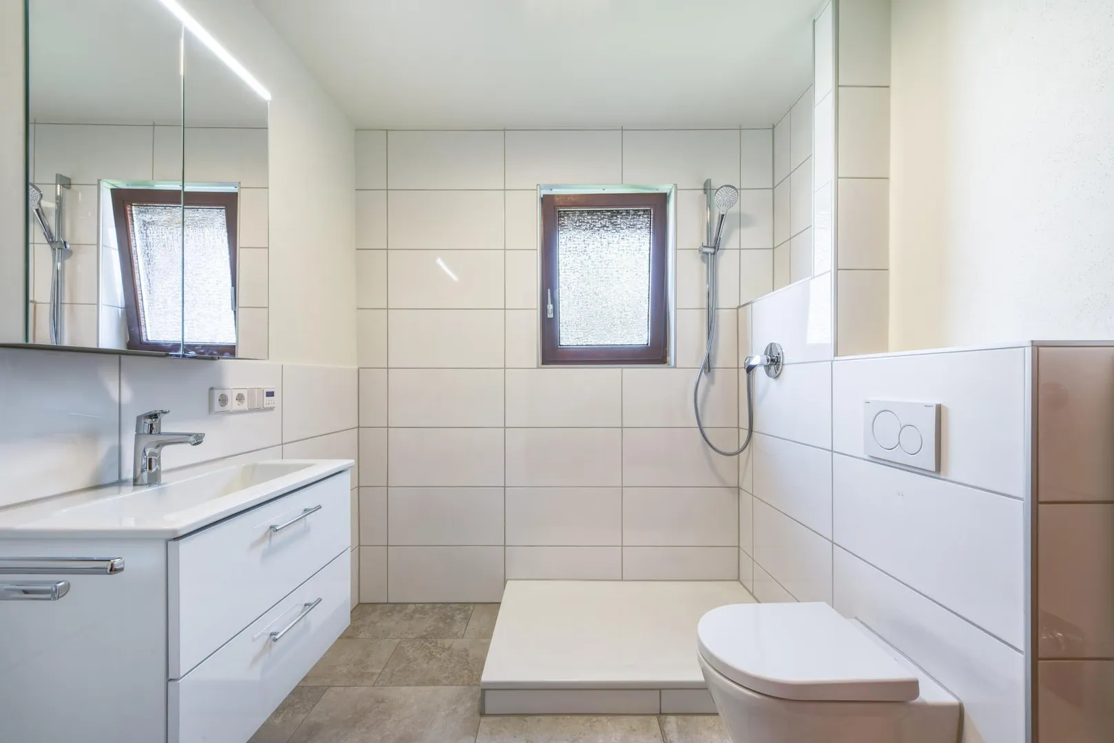 Das frisch modernisierte und teilweise raumhoch geflieste Badezimmer ist ausgestattet mit einem Fliesenboden, einer großzügigen Dusche, einem WC, einem Handtuch-Heizkörper, einem Waschmaschinen-Anschluss, einem Spiegelschrank, einem Waschtisch-Unterschrank sowie einem integrierten Radio.
