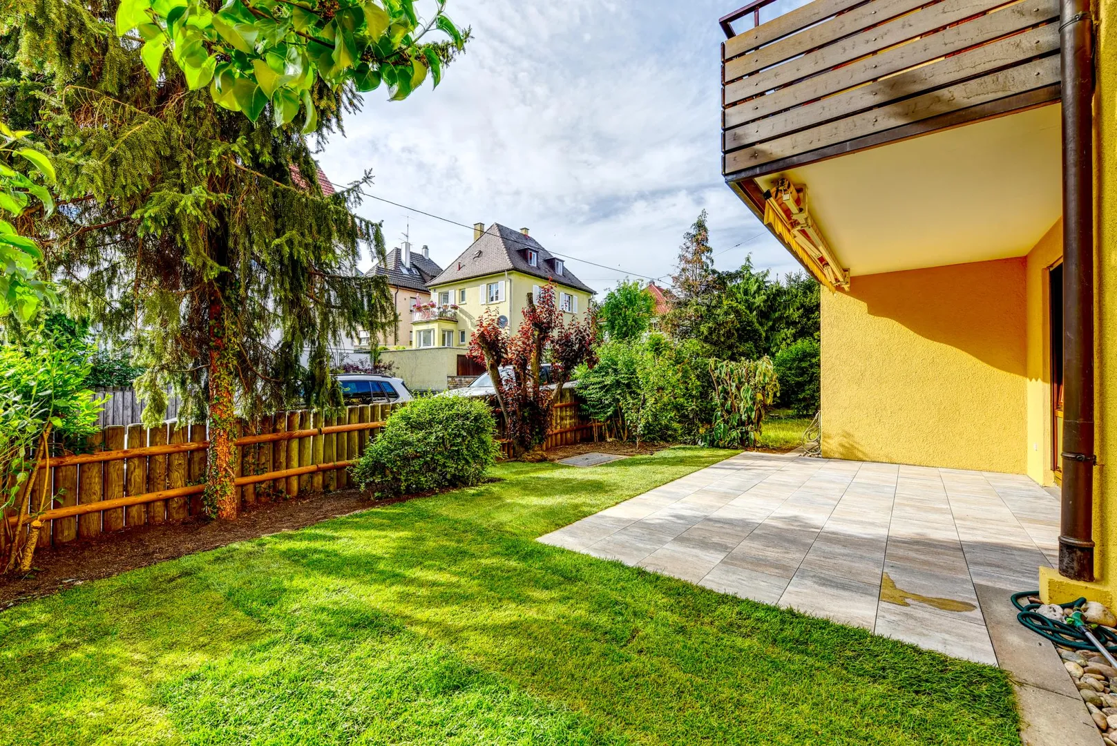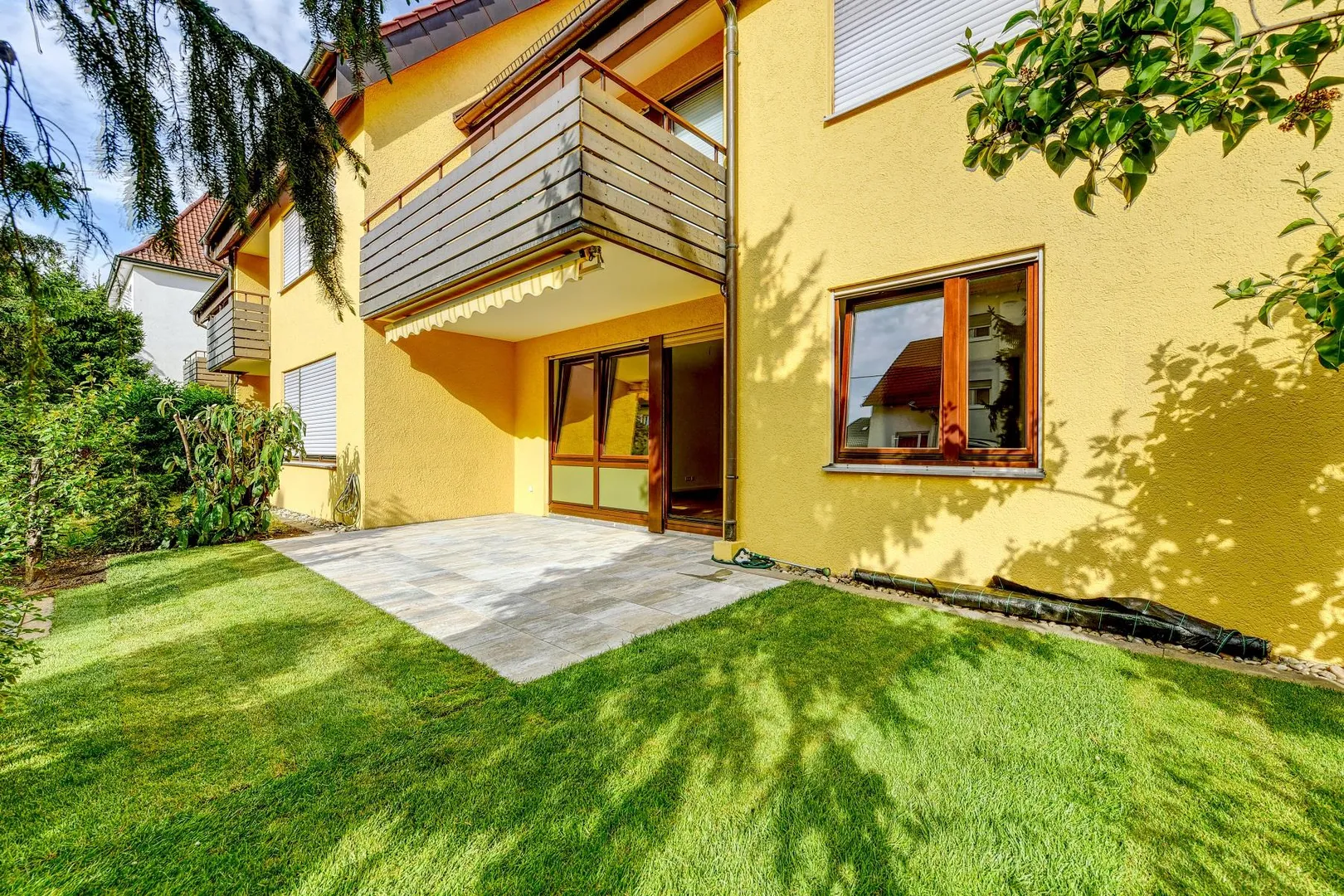 Der Grundriss ist gut: das Badezimmer verfügt über ein Fenster. Die ca. 15 m² große und überdachte West-Terrasse und Grünfläche sind über das Wohnzimmer begehbar. Die Rasenpflege ist vom Mieter zu übernehmen. Entsprechende Gerätschaften werden vom Vermieter gestellt. Bäume, Büsche und Hecken werden vom Gärtner gerichtet.