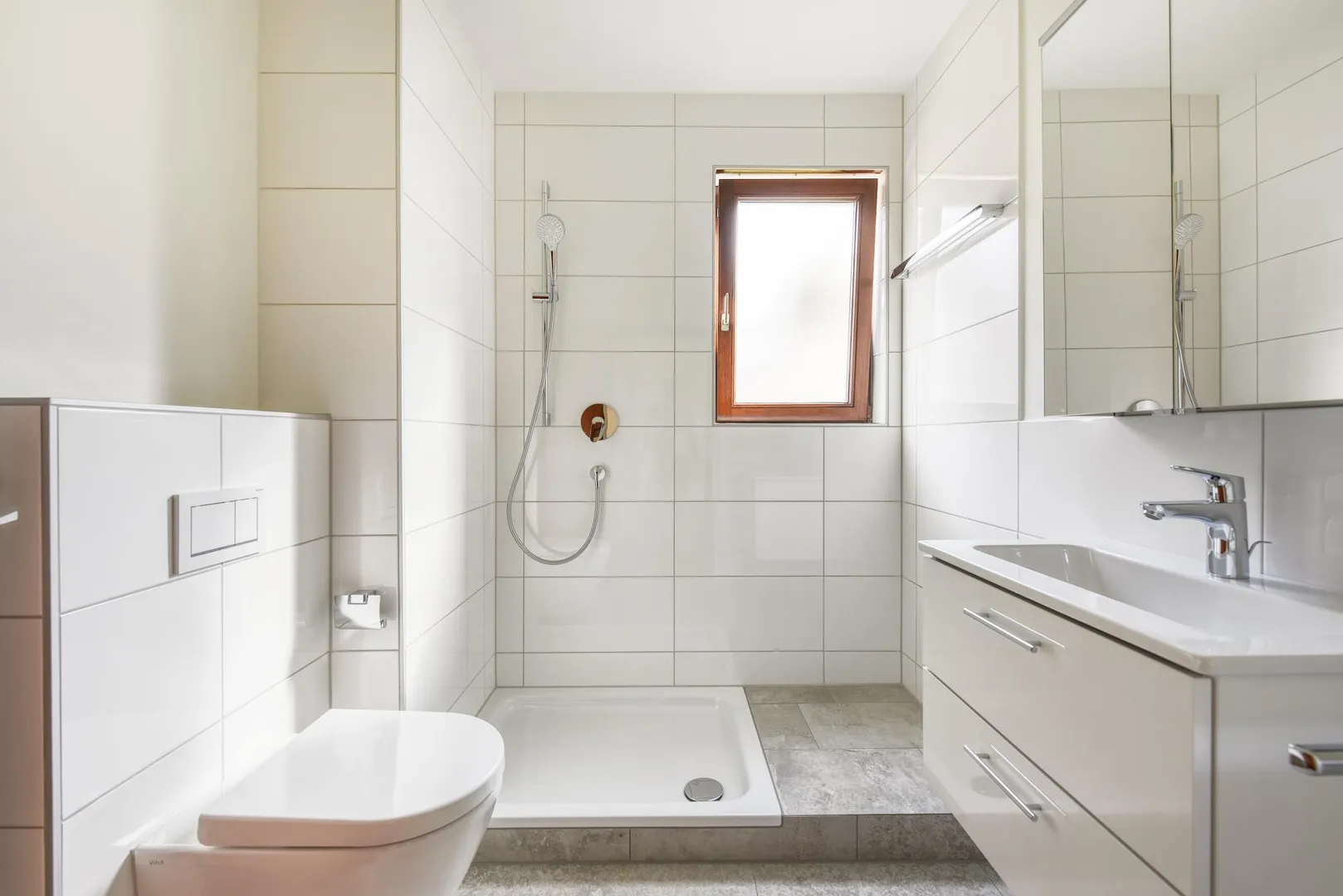 Das frisch modernisierte und teilweise raumhoch geflieste Badezimmer ist ausgestattet mit einem Fliesenboden, einer großzügigen Dusche, einem WC, einem Handtuch-Heizkörper, einem Waschmaschinen-Anschluss, einem Spiegelschrank, einem Waschtisch-Unterschrank sowie einem integrierten Radio.