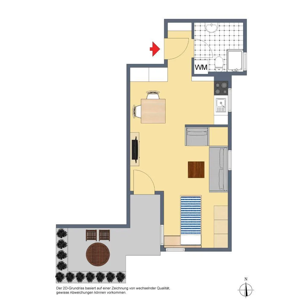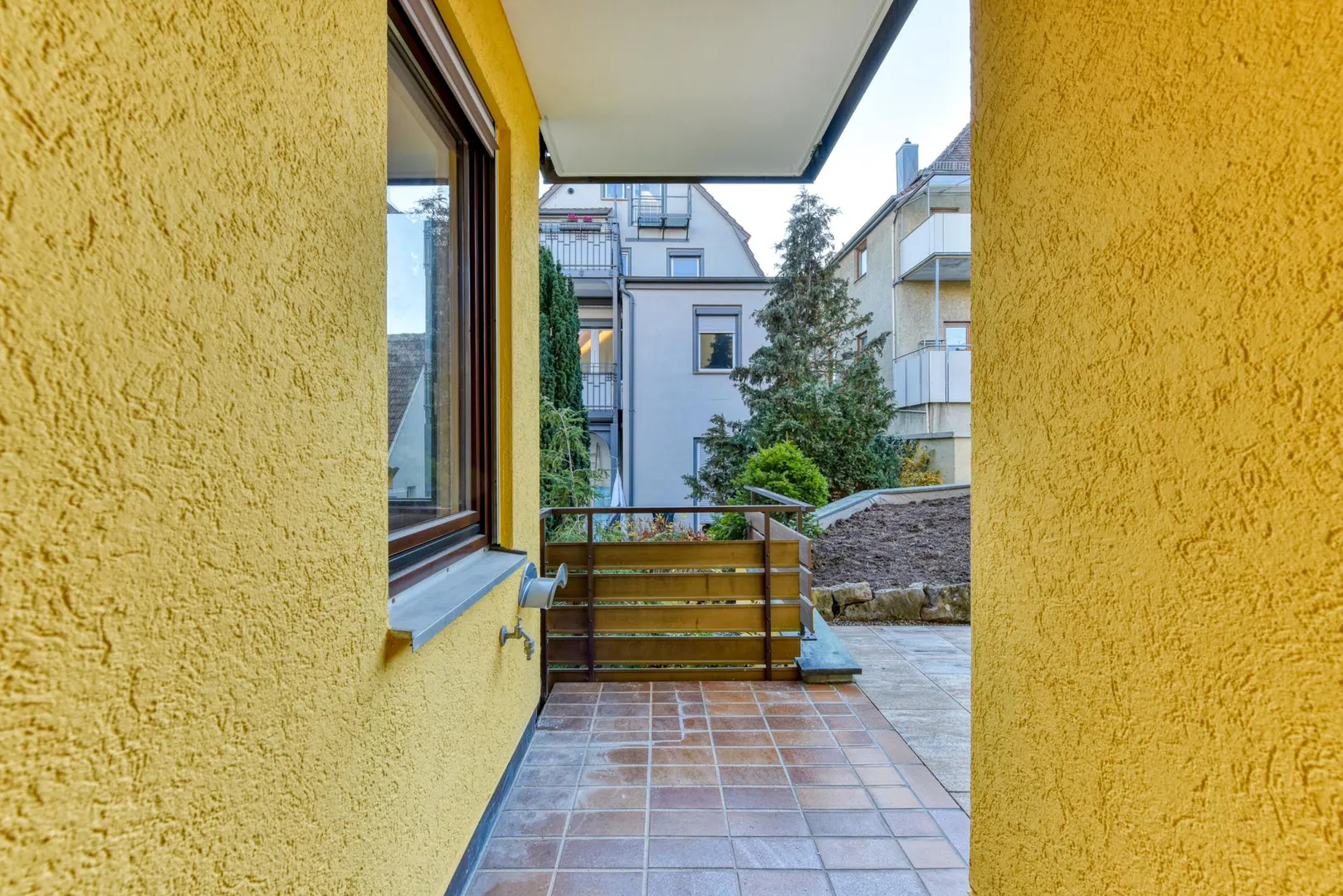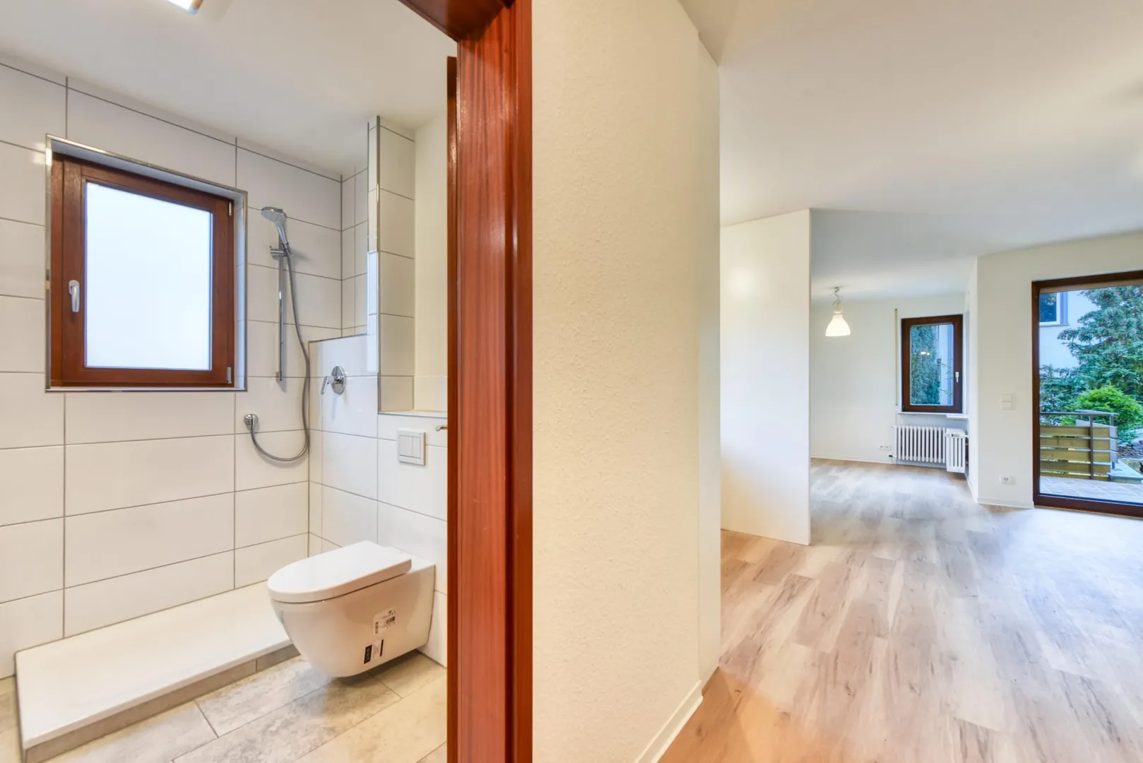 Der Grundriss ist gut: das Badezimmer verfügt über ein Fenster. Die ca. 9,7 m² große und teilüberdachte Süd/West-Terrasse ist über das Wohnzimmer begehbar.