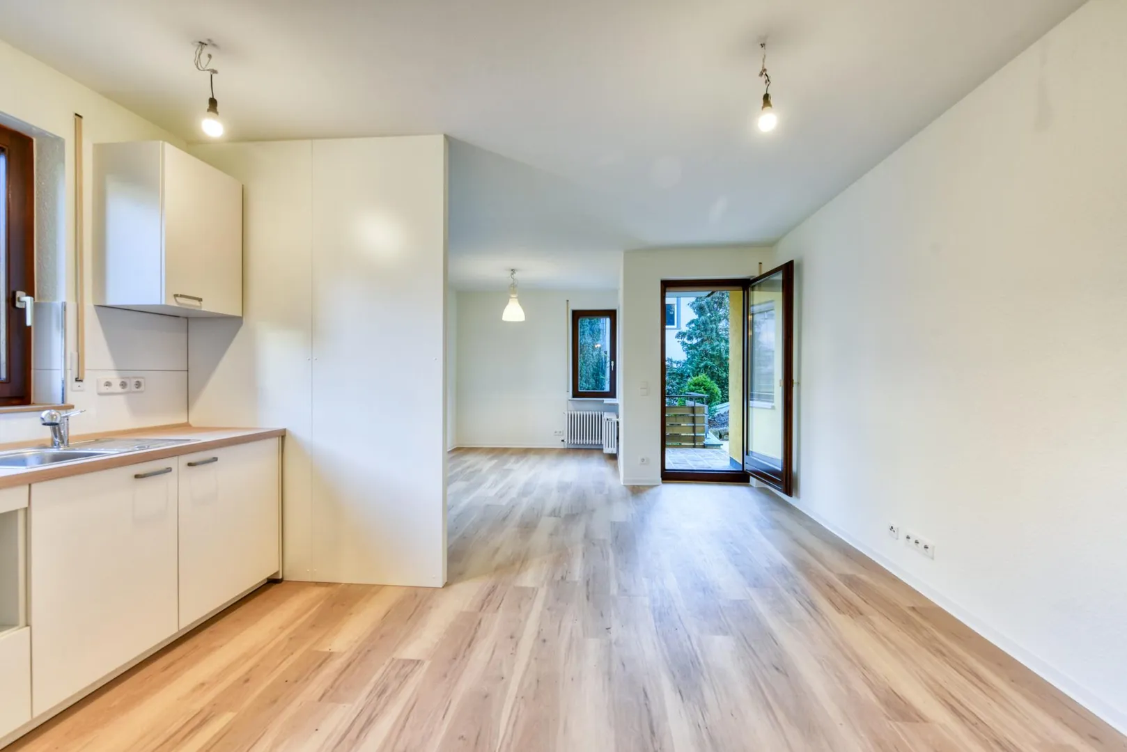 Diese frisch modernisierte 1-Zimmer-Wohnung, an eine Einzelperson, mit Süd/West-Terrasse befindet sich im Erdgeschoss.