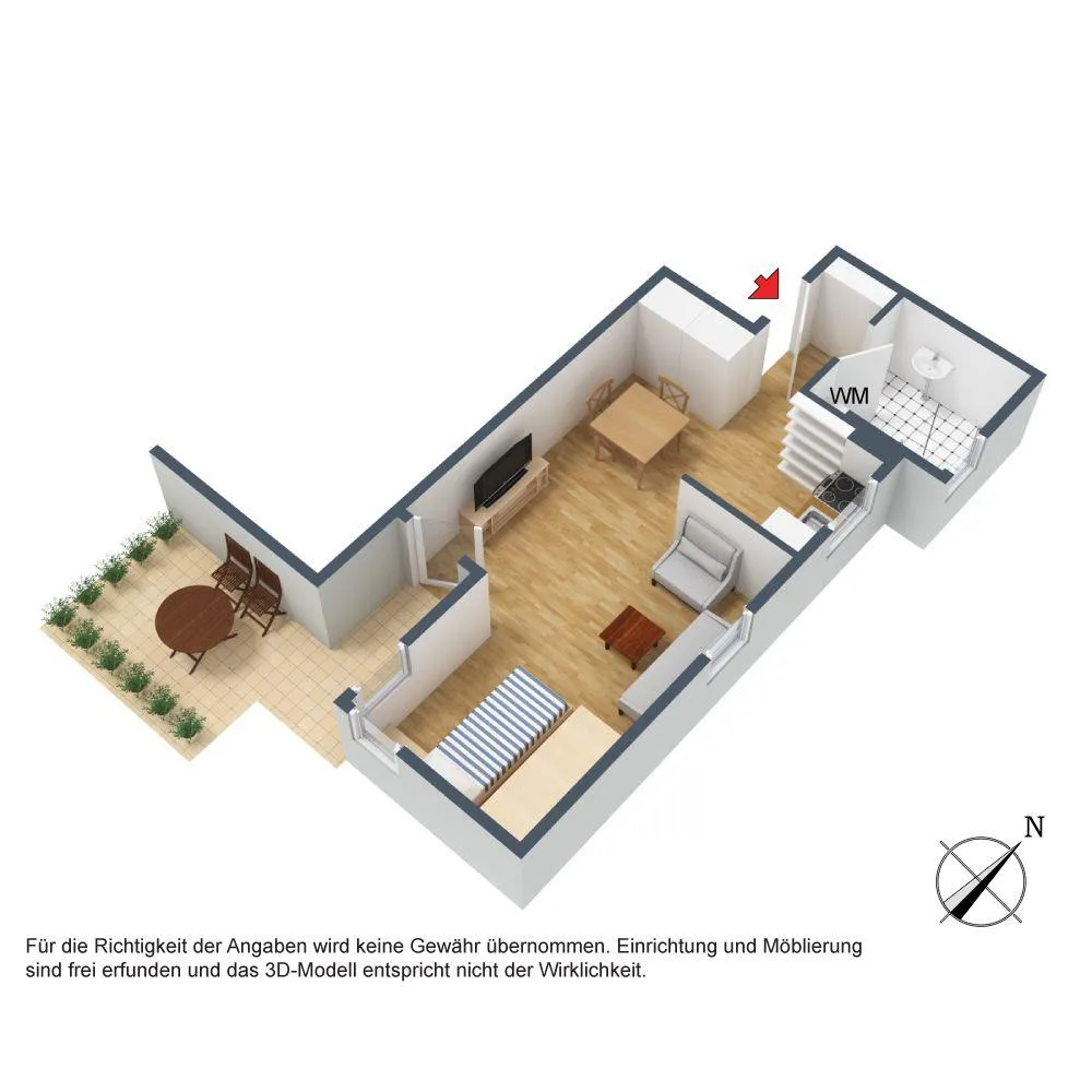 Die neue Einbauküche verfügt über einen Kühlschrank mit Gefrierfach, einen Herd mit 2 Kochplatten, eine Mikrowelle sowie Unter- und Oberschränke. Für die künftige Funktionsfähigkeit der E-Geräte übernimmt der Vermieter keine Haftung.