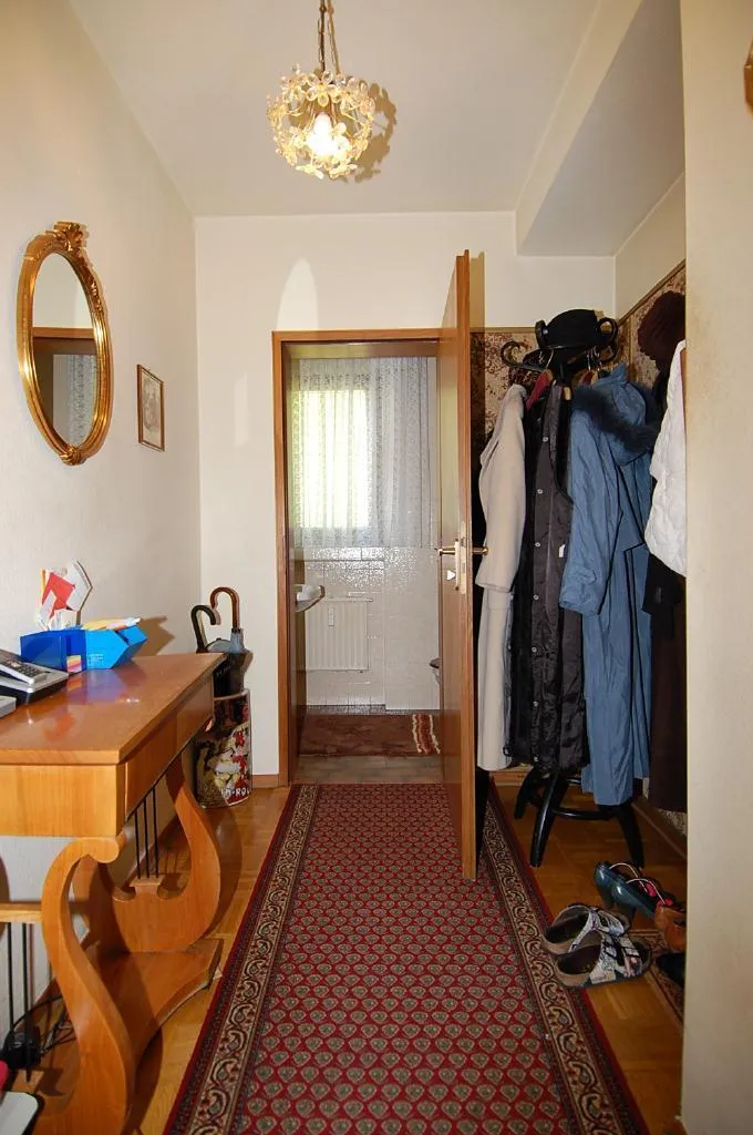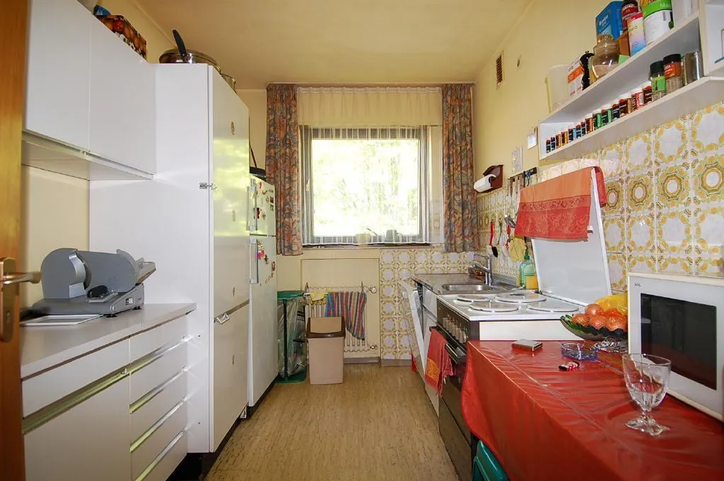 Die Wohnung wird aktuell renoviert: Die Wohnräume sind tapeziert und frisch gestrichen. Der bestehende Parkettboden (Eiche-Stäbchenmuster) wird aufgearbeitet und neu versiegelt, der auf den Bildern zu sehende Teppichboden wird entfernt und neuer Parkettboden verlegt. Neuer Fliesenboden und aufgearbeitete Wandfliesen in der Küche.