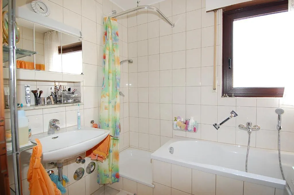 Das Bad ist raumhoch gefliest und mit Fenster, Fliesenboden, Badewanne und Dusche, Handtuchhalterheizkörper und zusätzlichem Waschmaschinenanschluss ausgestattet.