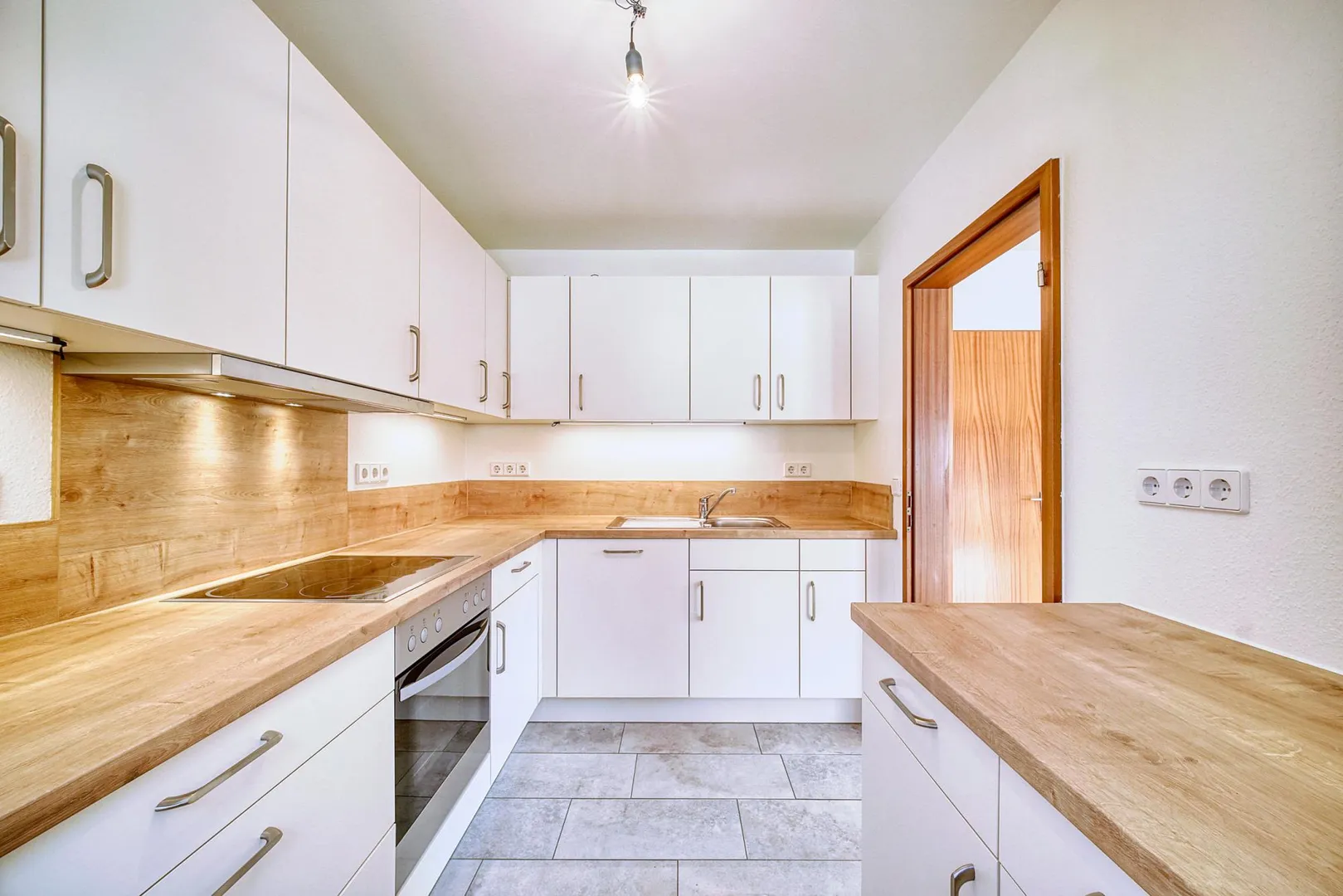 Die Küche ist über das Wohnzimmer begehbar und ist mit einer Einbauküche von 2017 ausgestattet. Die Einbauküche verfügt über alle gängigen Elektro-Geräte. Für die künftige Funktionsfähigkeit der Elektro-Geräte übernimmt der Vermieter keine Haftung. Die Einbauküche ist intensiv gereinigt wieder zurück zu geben.
