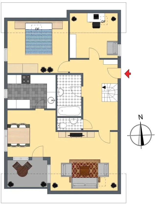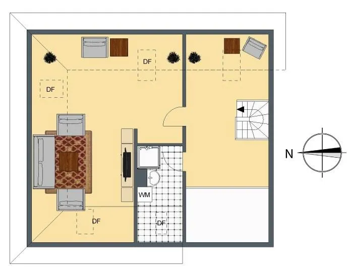 Auf der knapp 80 m² großen unteren Ebene (DG1) befinden sich das Wohnzimmer mit Dacheinschnitt und Küche, ein Bad mit Wanne, ein separates WC sowie zwei Zimmer.