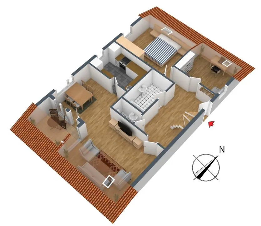 Der ca. 5 m² große Dach-Einschnitt ist über das Wohnzimmer begehbar und ist nach Westen ausgerichtet.