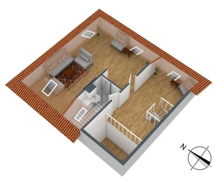 Auf der ca. 35 m² großen oberen Ebene (DG2) befinden sich die Galerie, das zweite Bad mit Fenster und Dusche sowie ein Dachzimmer.
