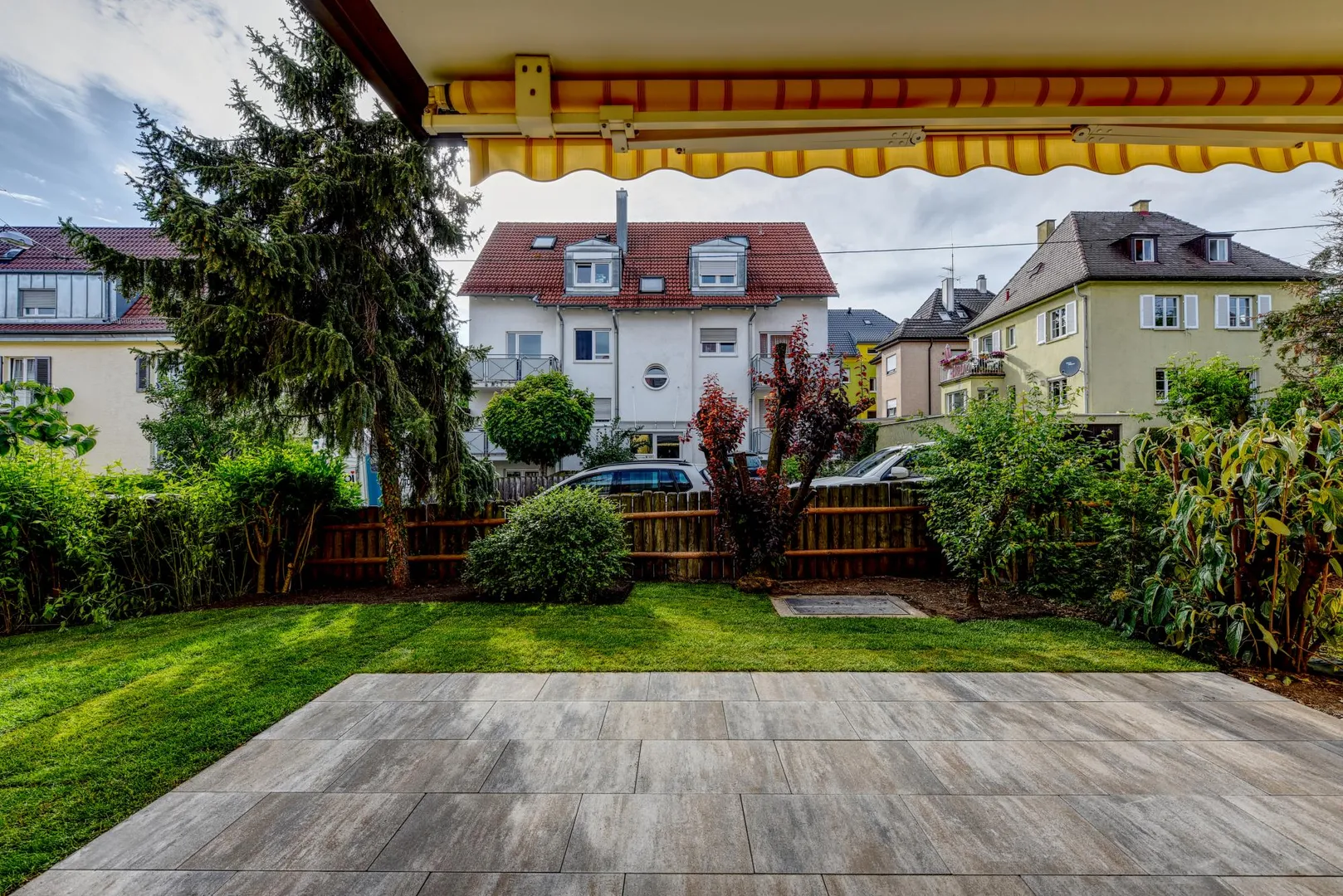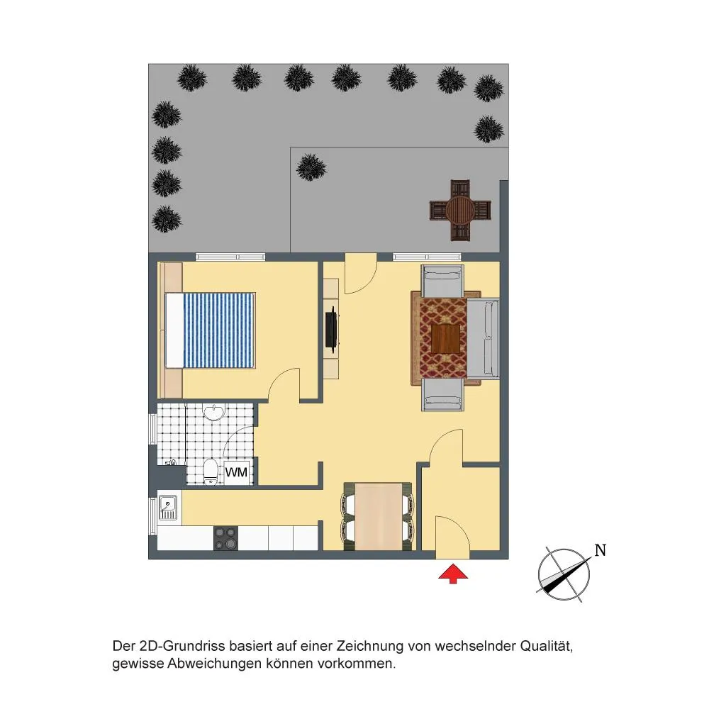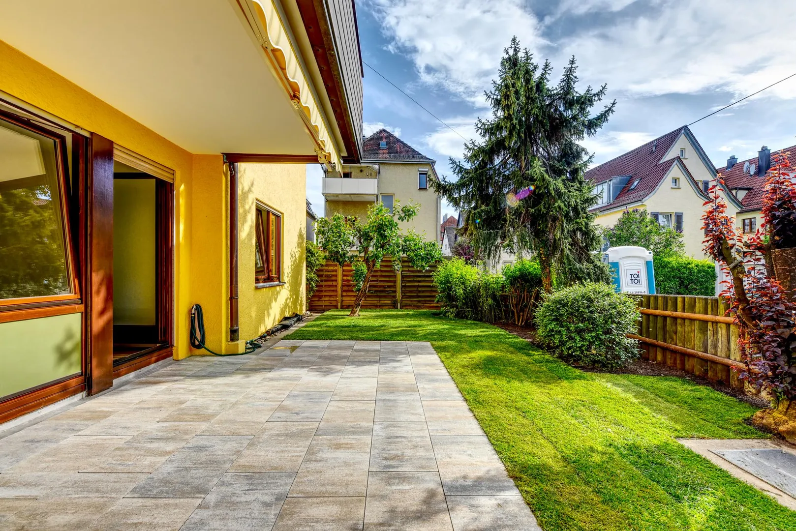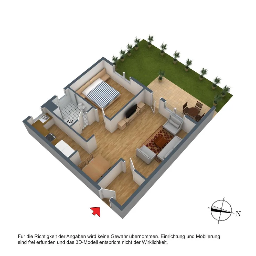 Der Grundriss ist gut: das Badezimmer verfügt über ein Fenster. Die ca. 15 m² große und überdachte West-Terrasse und Grünfläche sind über das Wohnzimmer begehbar. Die Rasenpflege ist vom Mieter zu übernehmen. Entsprechende Gerätschaften werden vom Vermieter gestellt. Bäume, Büsche und Hecken werden vom Gärtner gerichtet.