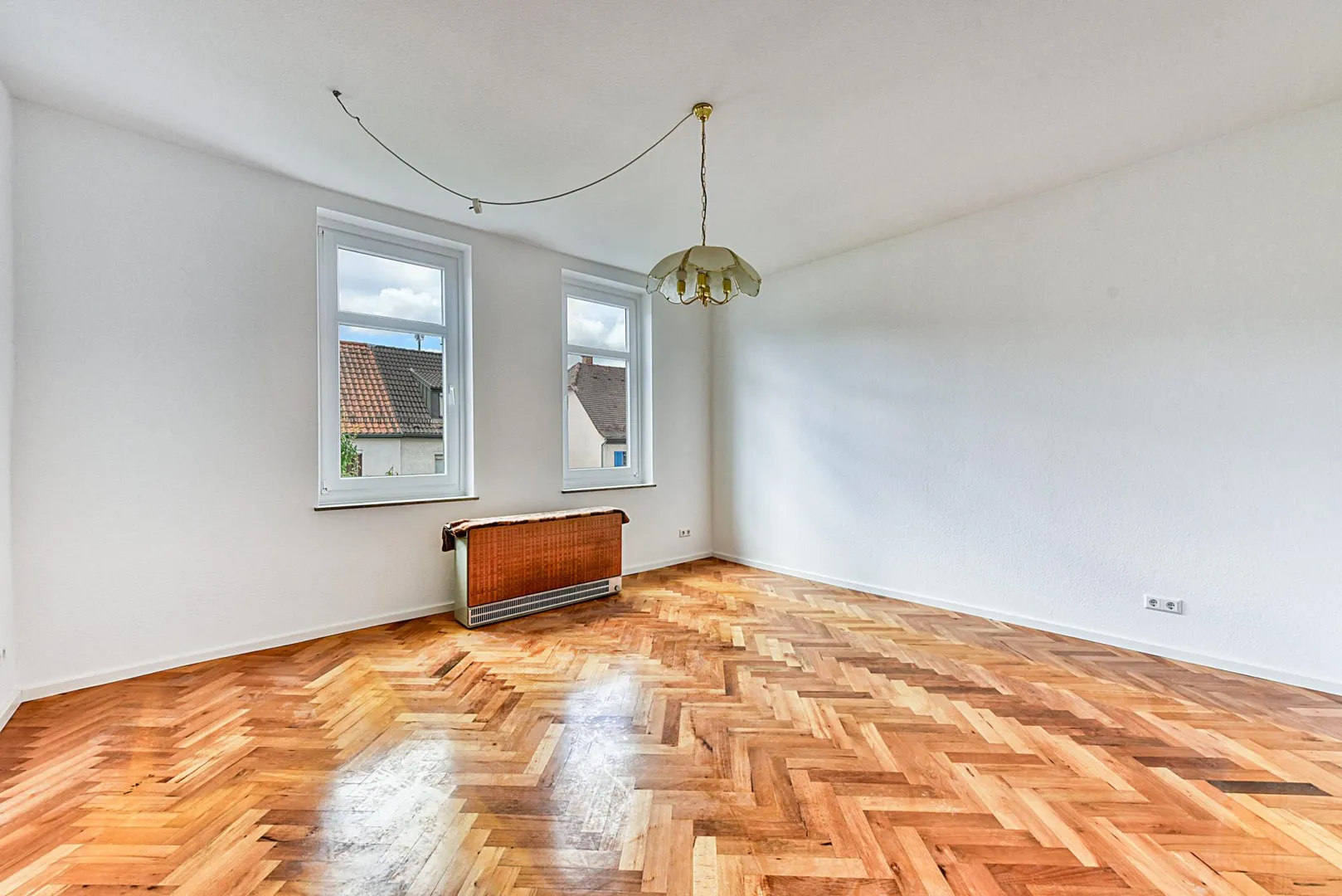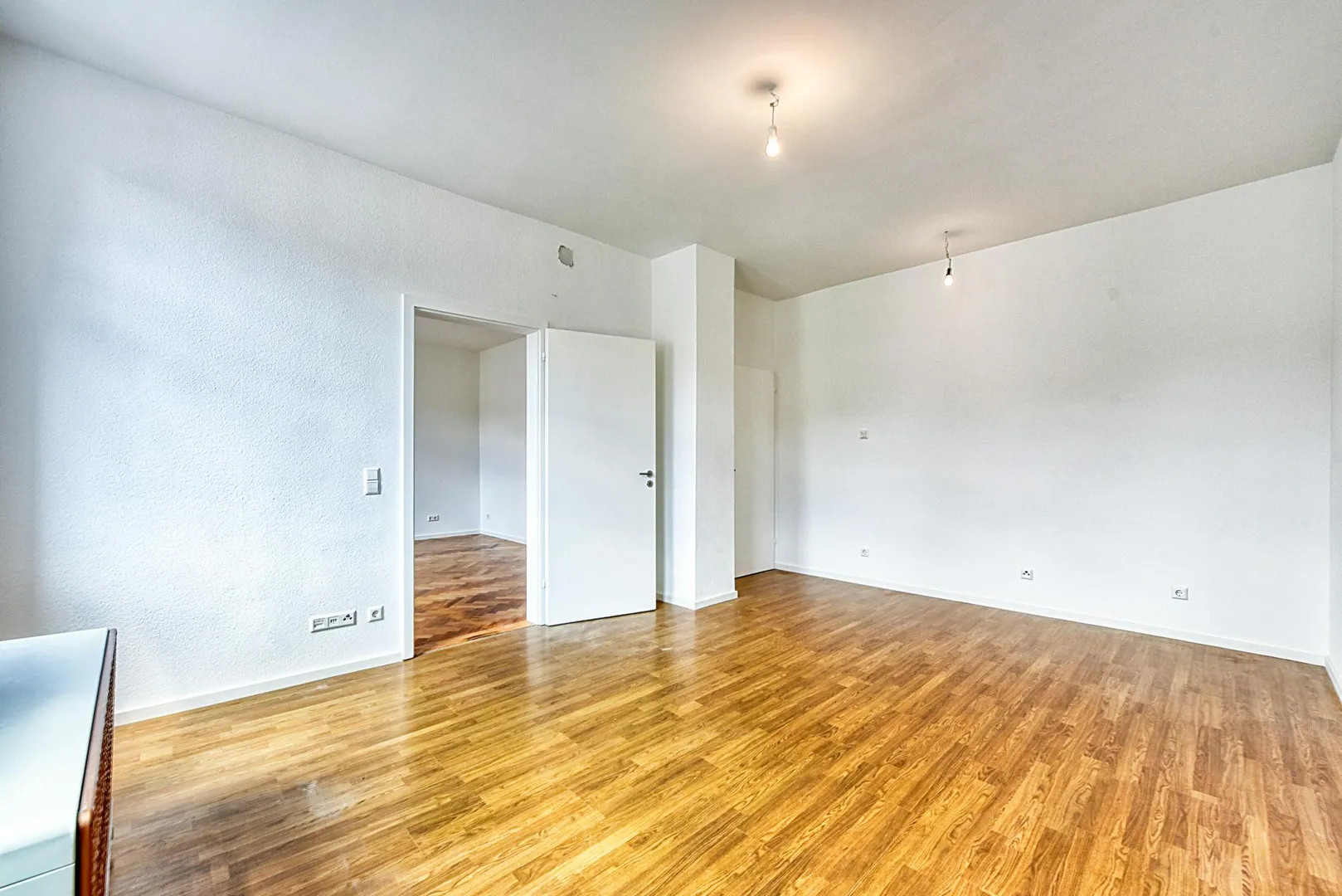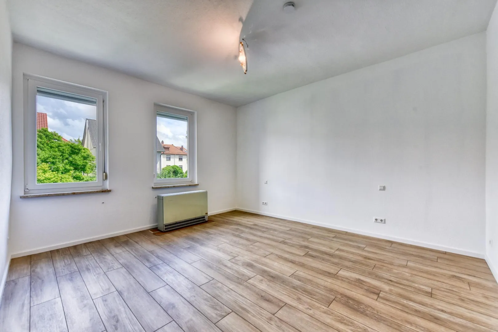 Die Wände sind überwiegend mit Raufasertapeten tapeziert und weiß gestrichen.