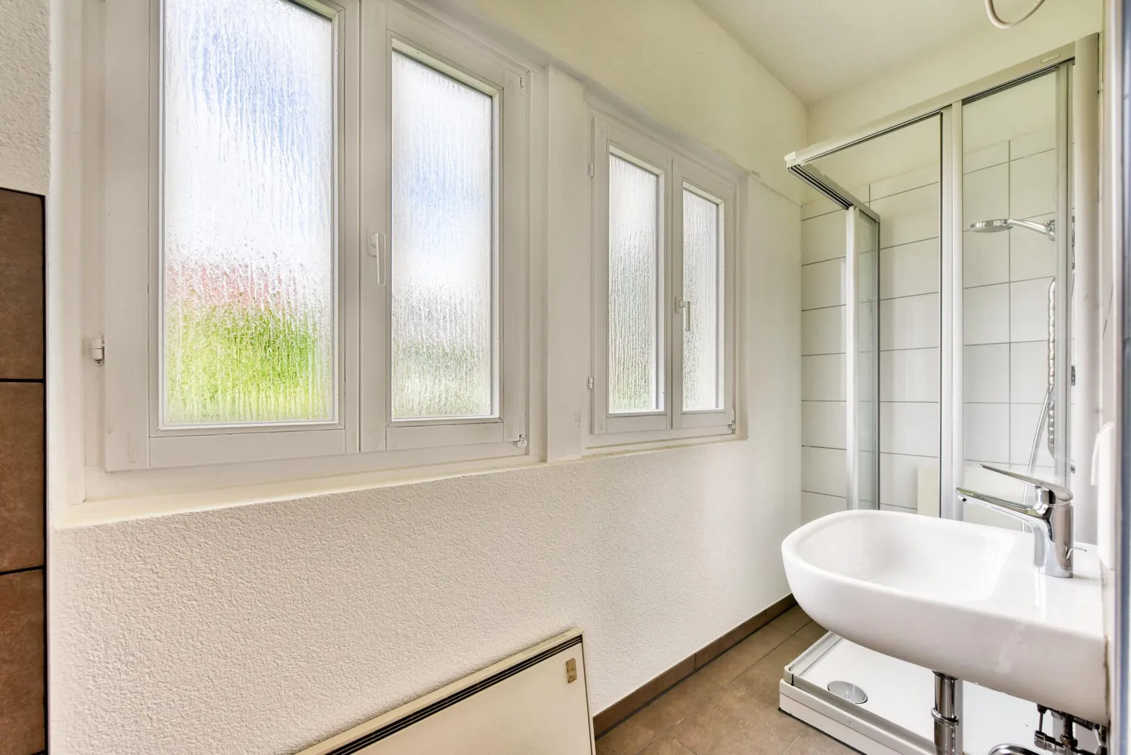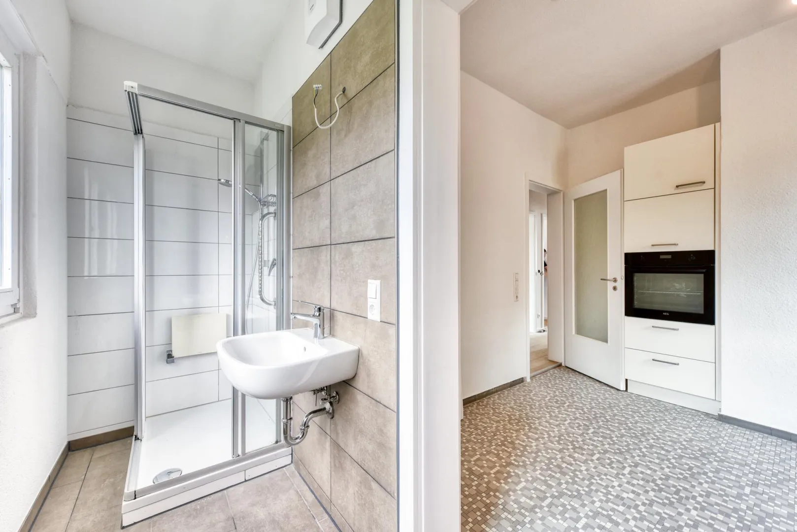 Das Tageslicht-Badezimmer ist ausgestattet mit einer Dusche, einem Waschmaschinen-Anschluss sowie einem belichteten Spiegel-Schrank.