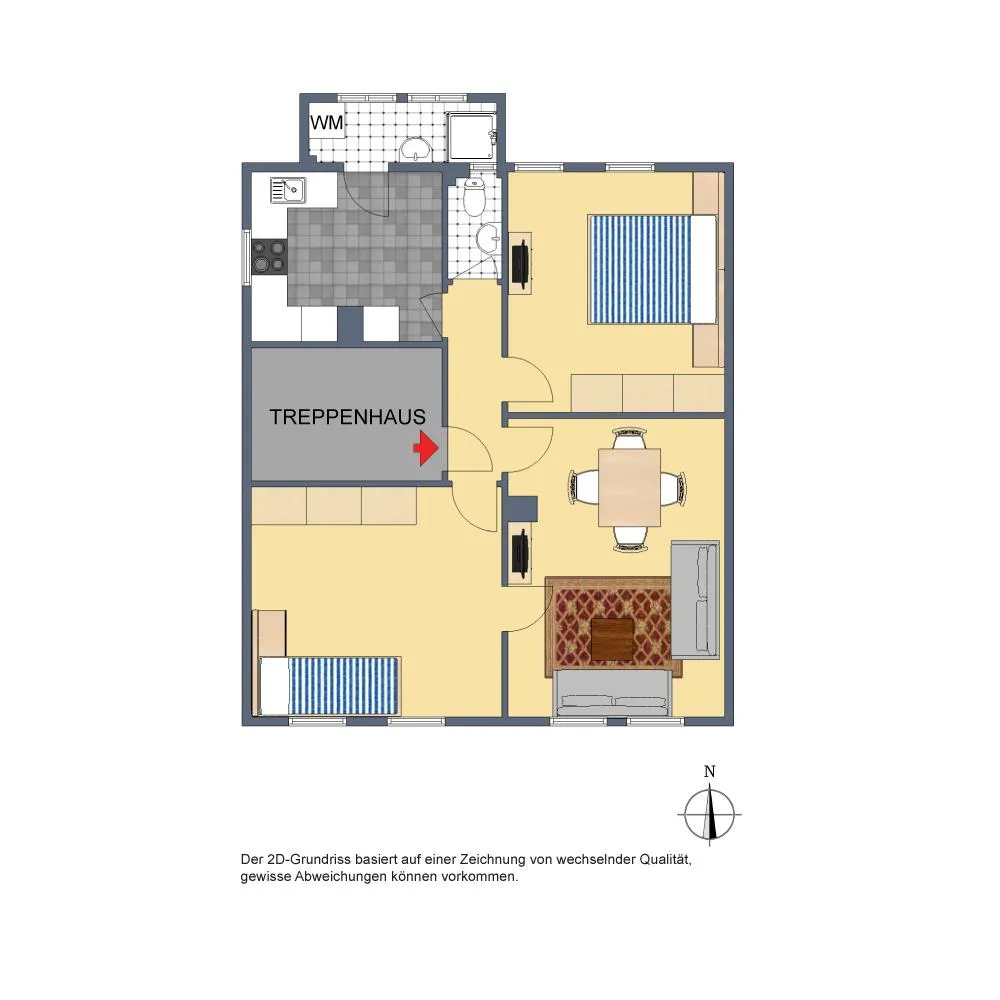 Der Grundriss ist Altbau typisch: die ehemalige Veranda wurde zum Badezimmer umfunktioniert und befindet sich hinter der Küche. Das separate WC verfügt über ein Fenster. Die Zimmer sind direkt vom Flur begehbar. Zudem gibt es eine Verbindungstür zwischen Wohn- und Arbeits-/Kinderzimmer.