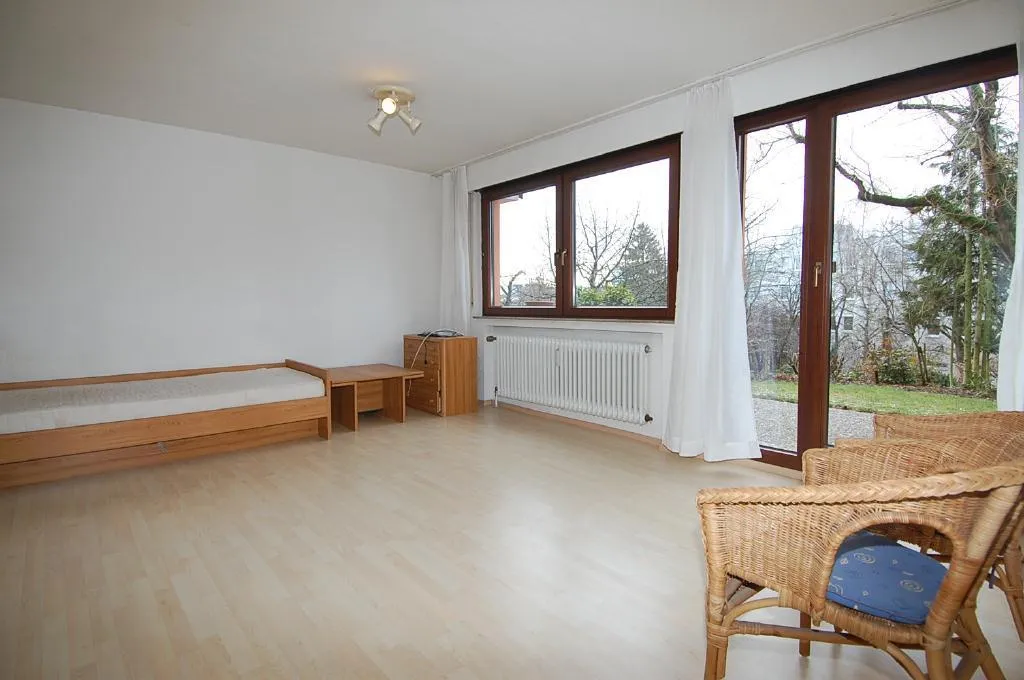 Diese möblierte 1-Zimmer Wohnung mit Süd-West-Terrasse befindet sich im Untergeschoss (Souterrain) einer gepflegten 3-Familien-Doppelhaushälfte.
