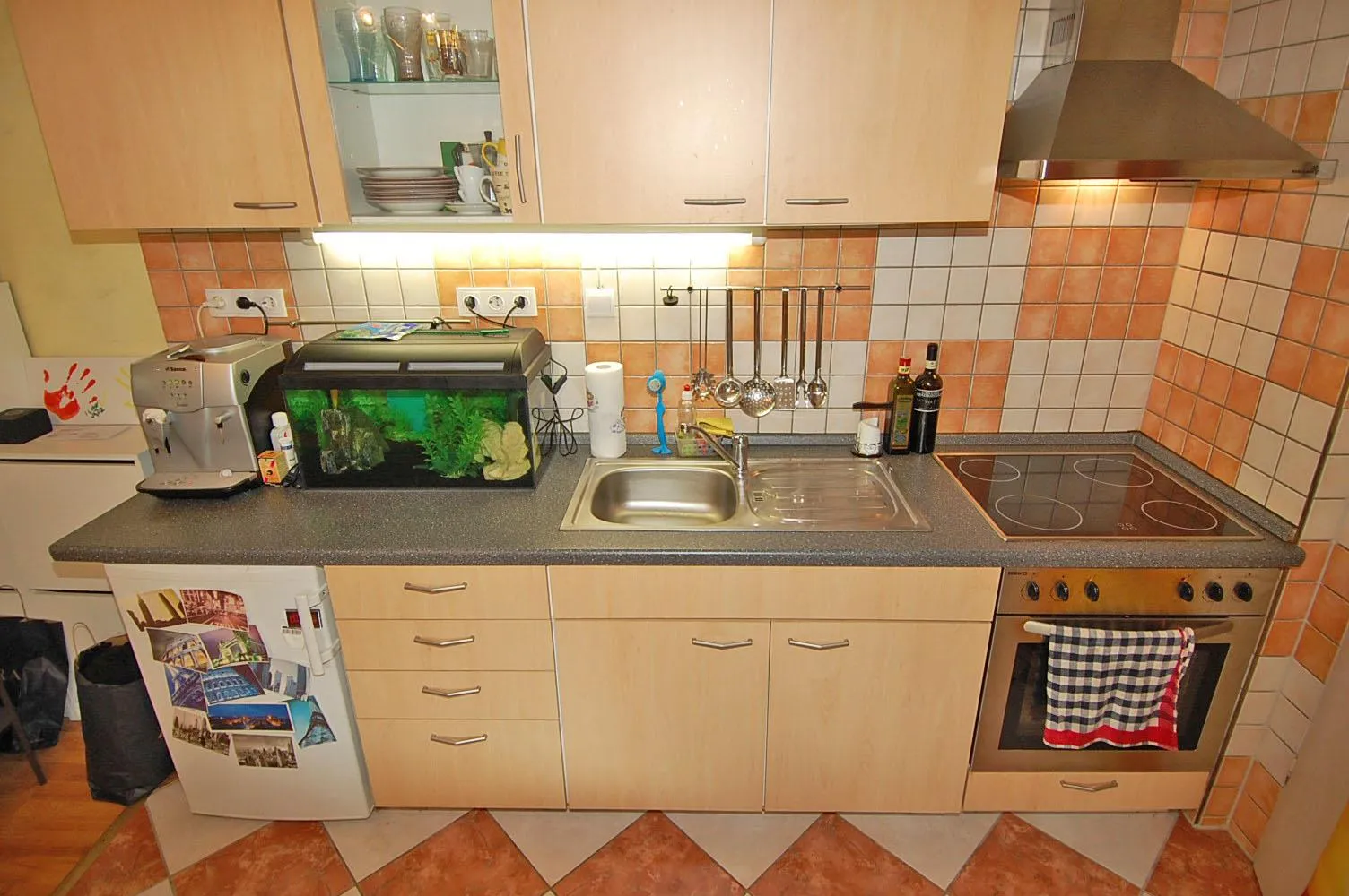 Die Küchenzeile verfügt über: Kühl-/Gefrierschrank, Cerankochfeld, Backofen, Dunstabzug, Spüle sowie Ober- und Unterschränke.