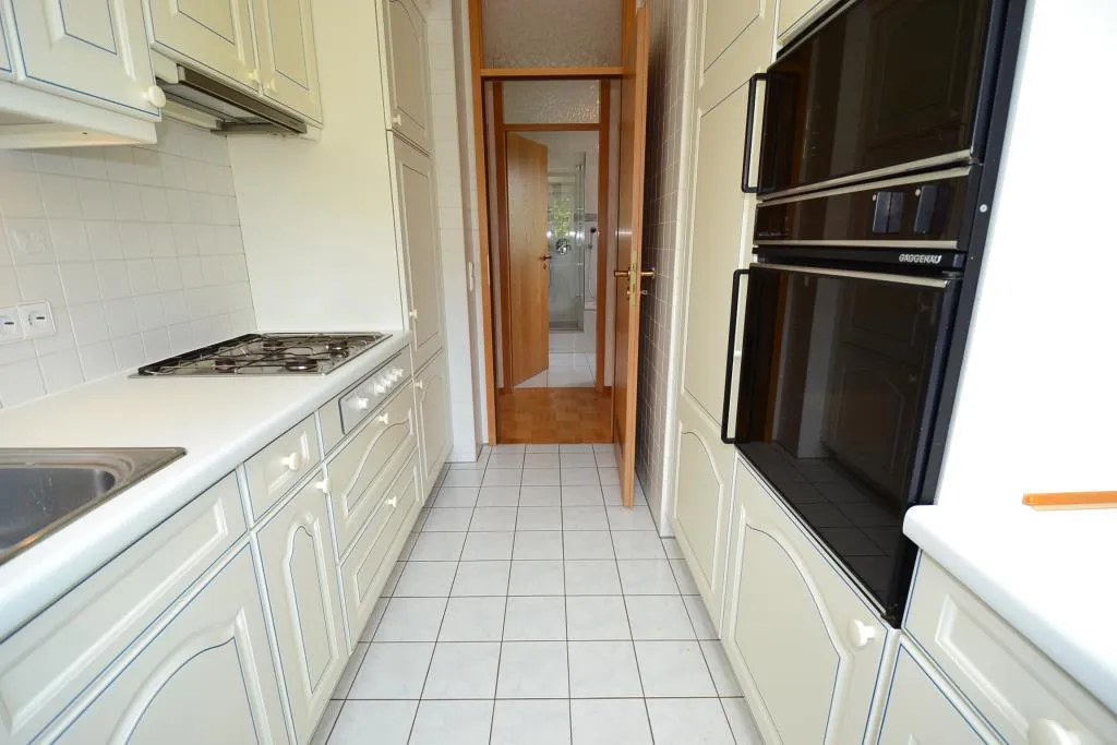 Die Küche ist mit einer Einbauküche ausgestattet. In der Küche ist kein Gefrierschrank vorhanden. Ein eigener Gefrierschrank kann im Keller abgestellt werden. Die Küche befindet sich in einem gepflegten Zustand. Die Elektrogeräte sind funktionsfähig. Für die künftige Funktionsfähigkeit der E-Geräte übernimmt der Vermieter keine Haftung.