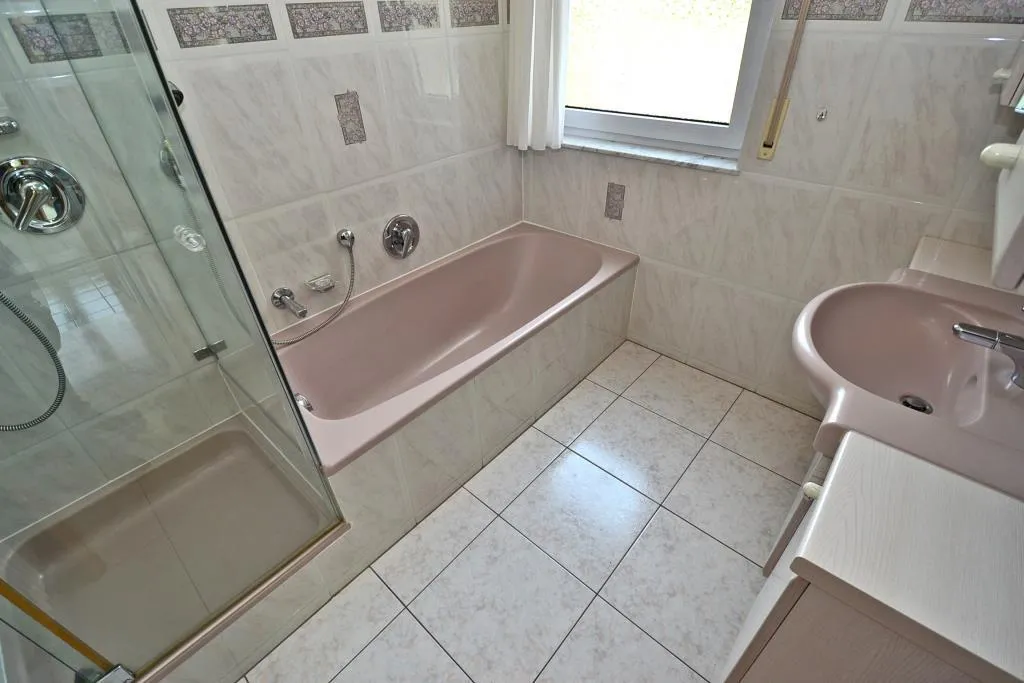 Das raumhoch geflieste Badezimmer mit Fenster ist ausgestattet mit einer Badewanne, einer Dusche, einem Waschbecken mit Waschtischunterschrank sowie einem Spiegelschrank.