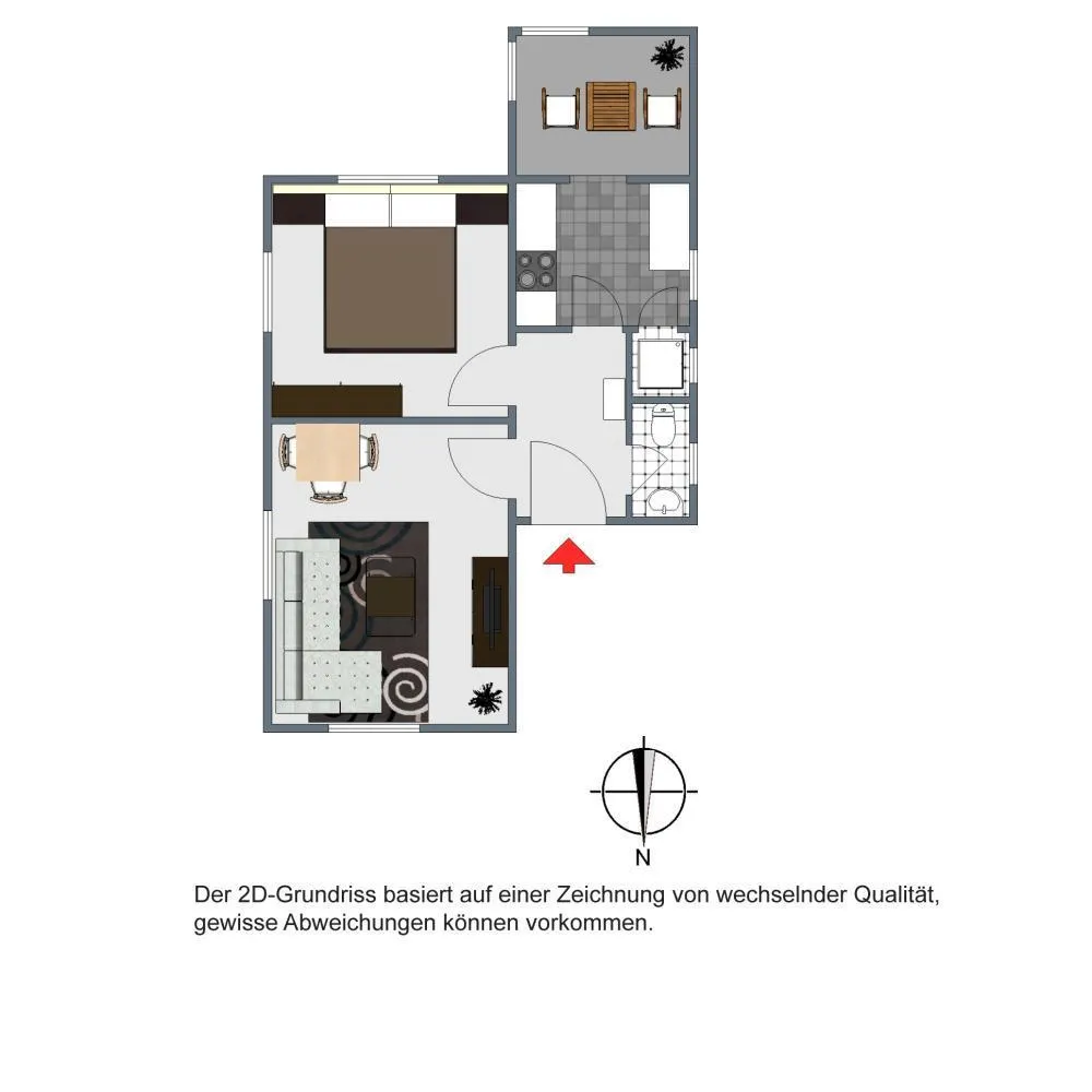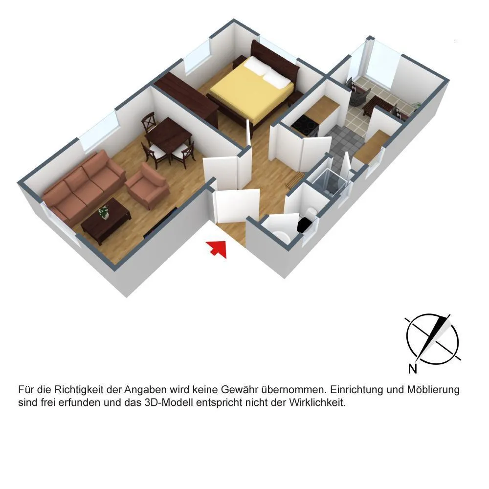 Vom Flur sind das Wohnzimmer, das Schlafzimmer, die Küche sowie das WC begehbar. Von der Küche aus sind die Dusche sowie das offene Arbeitszimmer begehbar.