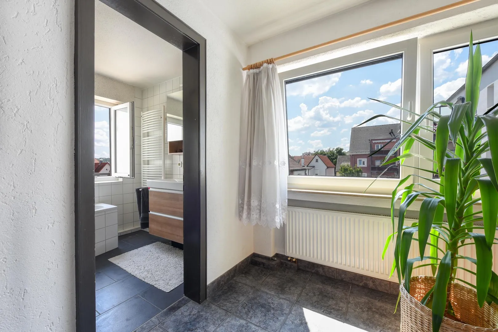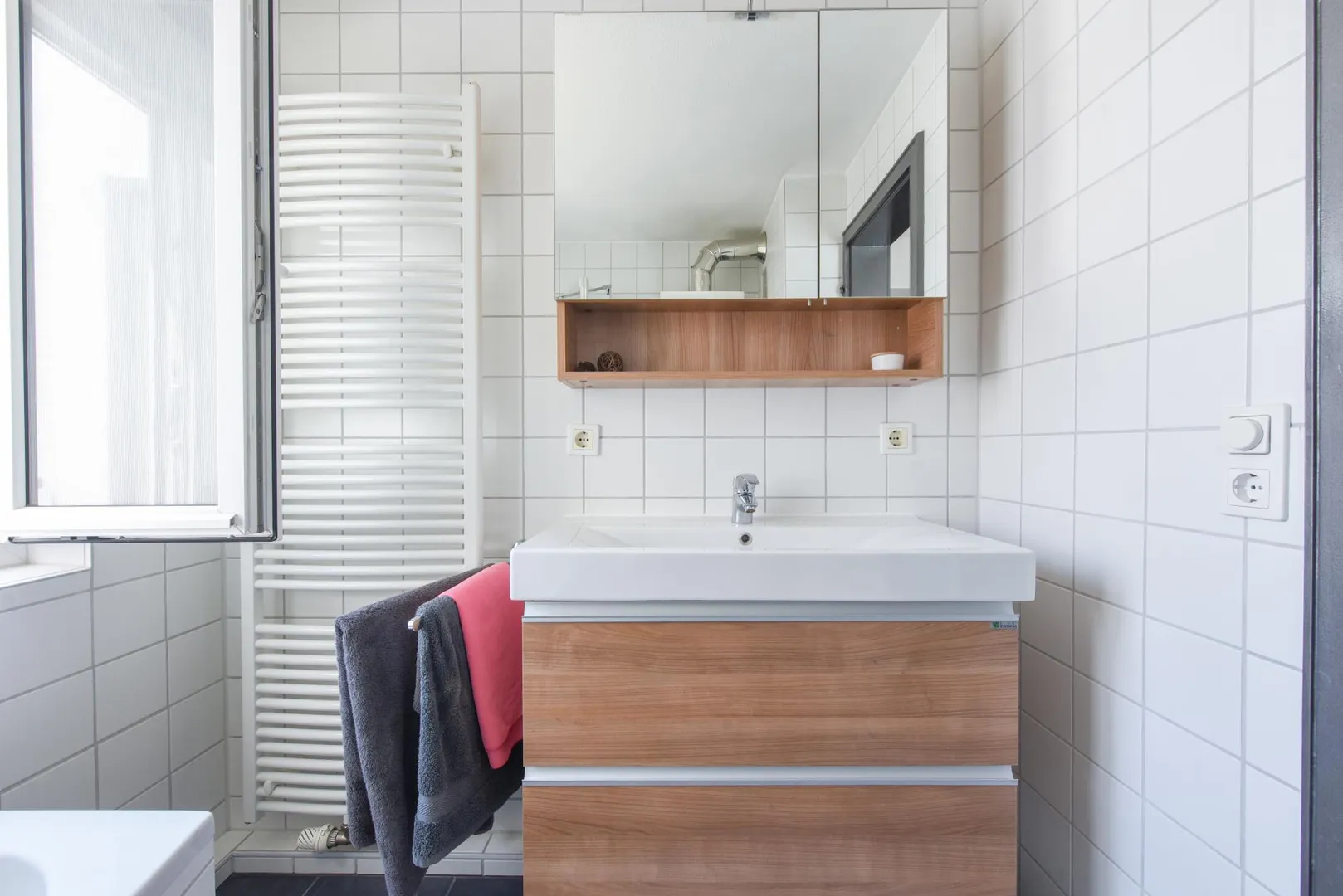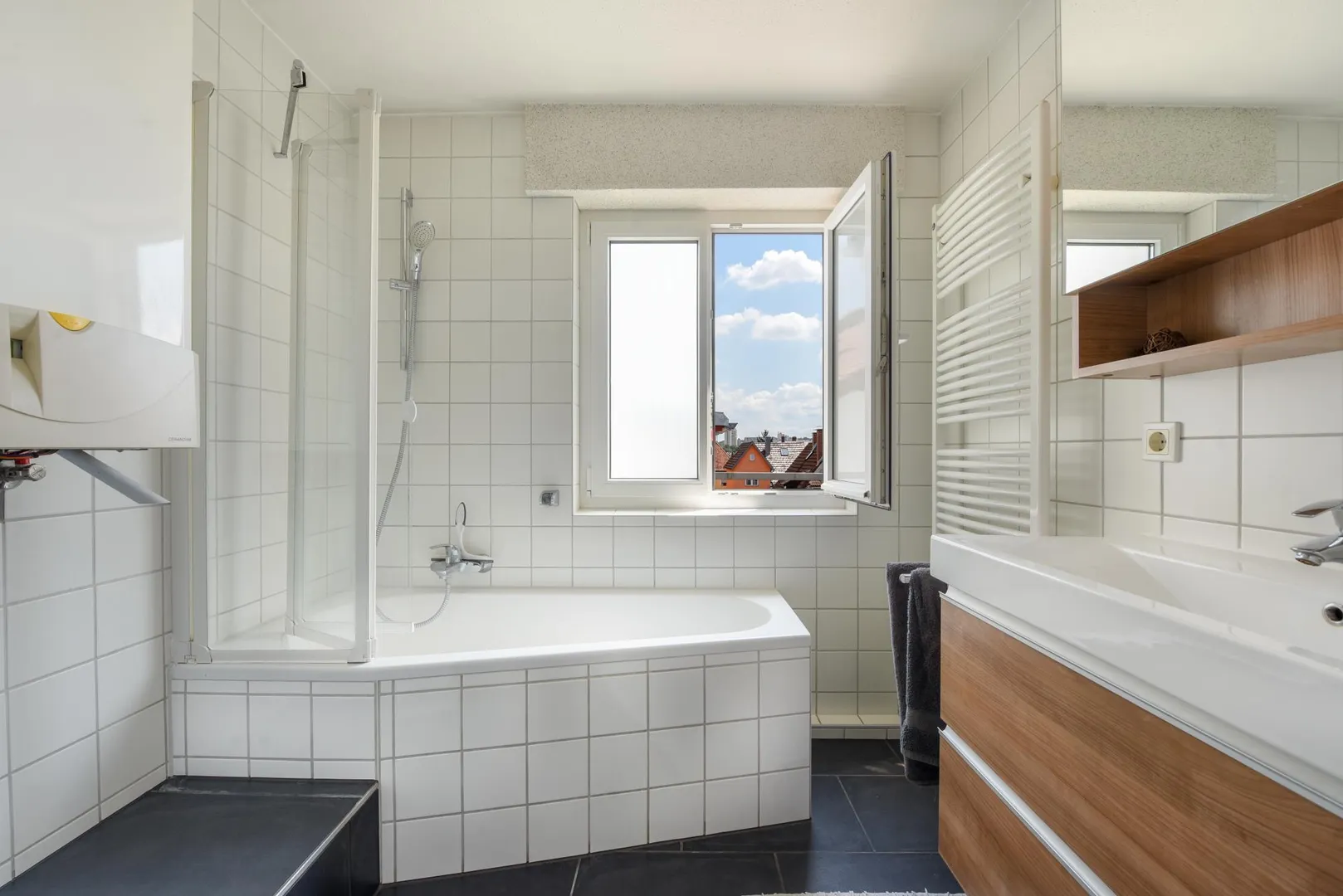- freundlich modernisiertes Bad: raumhoch weiß gefliest, ausgestattet mit großen, anthrazitfarbenen Bodenfliesen, Wanne mit Duschmöglichkeit, Handtuchhalter-Heizkörper, übergroßes Waschbecken mit Unterbau, Spiegelschrank und Fenster