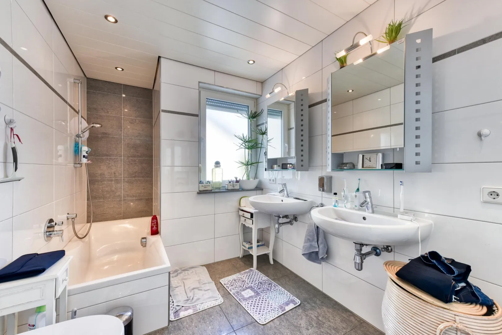 Das größere Badezimmer mit Fenster ist raumhoch gefliest und ist ausgestattet mit einem Fliesenboden, einer Badewanne, einem WC, einem Handtuch-Heizkörper, zwei Waschbecken, zwei Spiegelschränken sowie einer abgehängten Halogendecke.