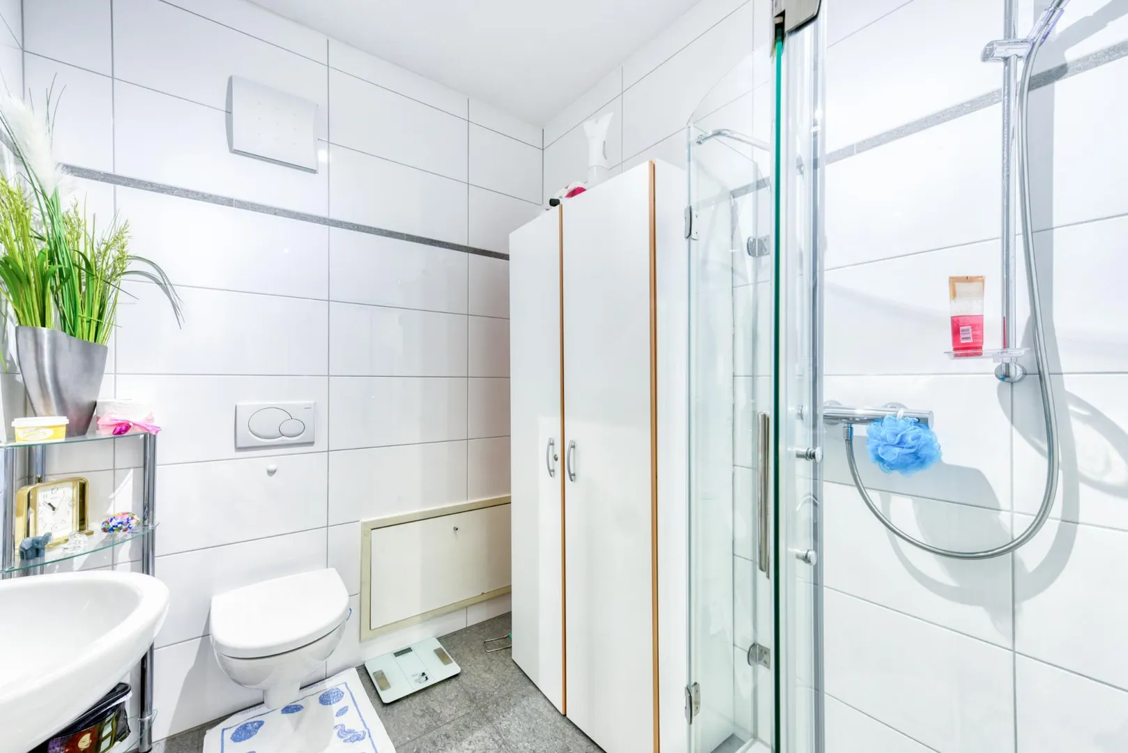 Das innenliegende Badezimmer ist raumhoch gefliest und ist ausgestattet mit einem Fliesenboden, einer Dusche, einem WC sowie einem belichteten Spiegel.