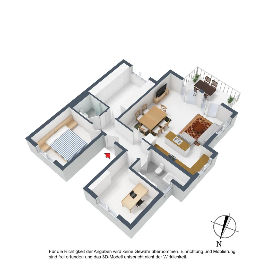 Der Grundriss ist sehr gut. Alle Zimmer sind direkt vom Flur begehbar. Die Küche ist zum Wohn-/Essbereich offen. Der ca. 12 m² große Süd-Balkon ist über das Wohnzimmmer begehbar. Die Wohnung verfügt über zwei Bäder mit jeweils einem WC.