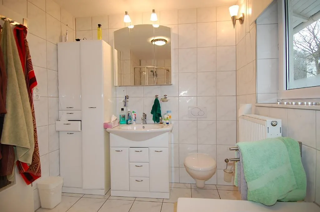 Das Tageslichtbadezimmer ist raumhoch gefliest. Es ist ausgestattet mit einem Fliesenboden, einer Wanne, einer Dusche, einem WC und Badmöbeln.