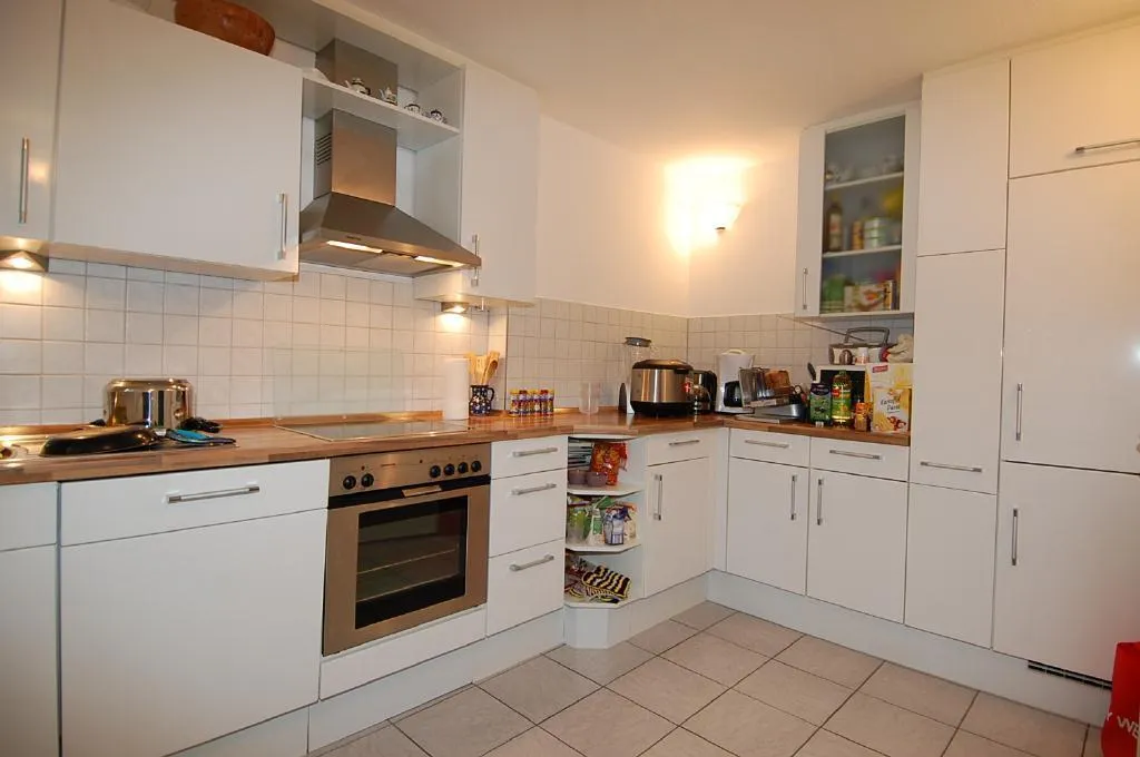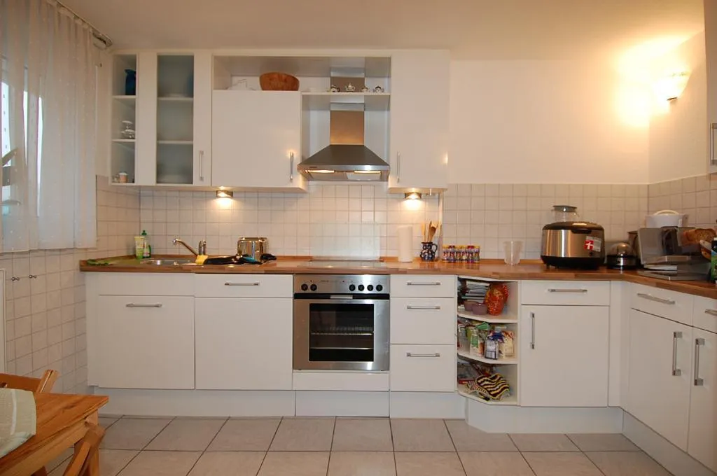 Die Küche ist mit einer hoch- und neuwertigen Einbauküche mit weißen Hochglanz-Fronten ausgestattet.