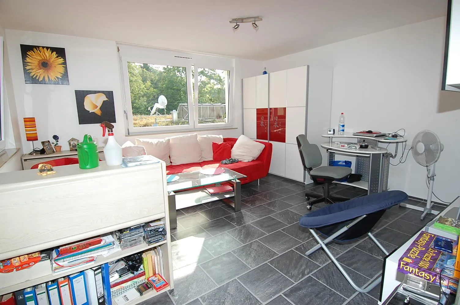 Hier sind schöne helle Laminatböden verlegt. Das Badezimmer ist hell gefliest. Im Obergeschoss verfügen Sie über ein wunderschönes helles großes Zimmer das mit sehr schönen Fliesen ausgestattet ist. Von hier haben Sie Zugang zur Dachterrasse, ebenso haben Sie hier noch einen Raum der zur Zeit als Bügelzimmer genutzt wird, hier befindet sich auch die Heizanlage. Aus diesem zimmer kann man ohne großen Aufwand ein zweites Bad machen da die Wasserrohre schon da sind. Im Untergeschoss befindet sich ein sehr grosses Zimmer/Hobbyraum den man auch als Wohnraum nutzen kann.