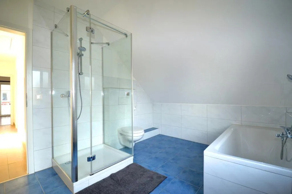 Das Badezimmer ist teilweise raumhoch, weiß gefliest und ist mit einer Wanne, einer Dusche, einem Waschbecken sowie einem WC ausgestattet.