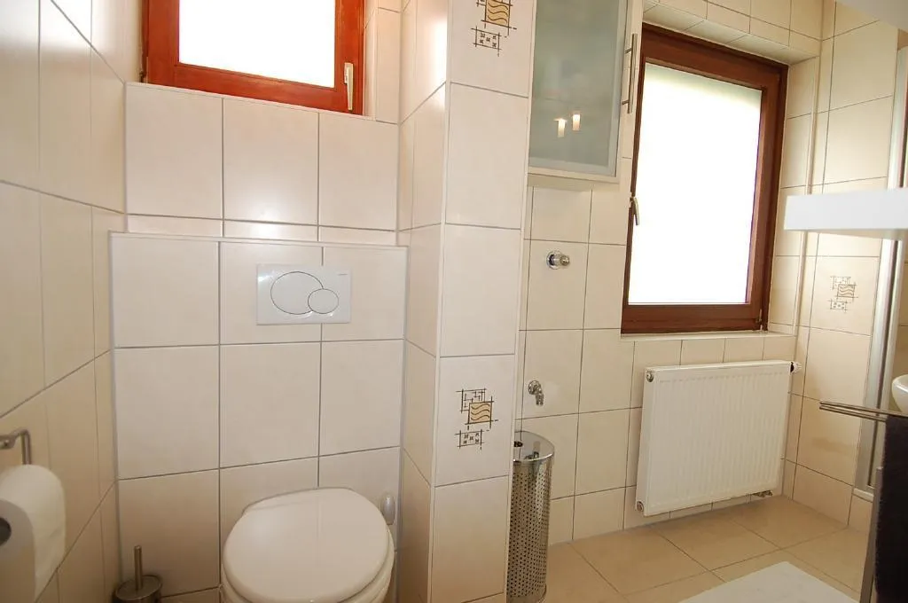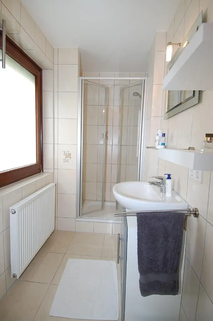 Das Tageslichtbad ist hell und schön. Das Bad ist mit einer Dusche ausgestattet.