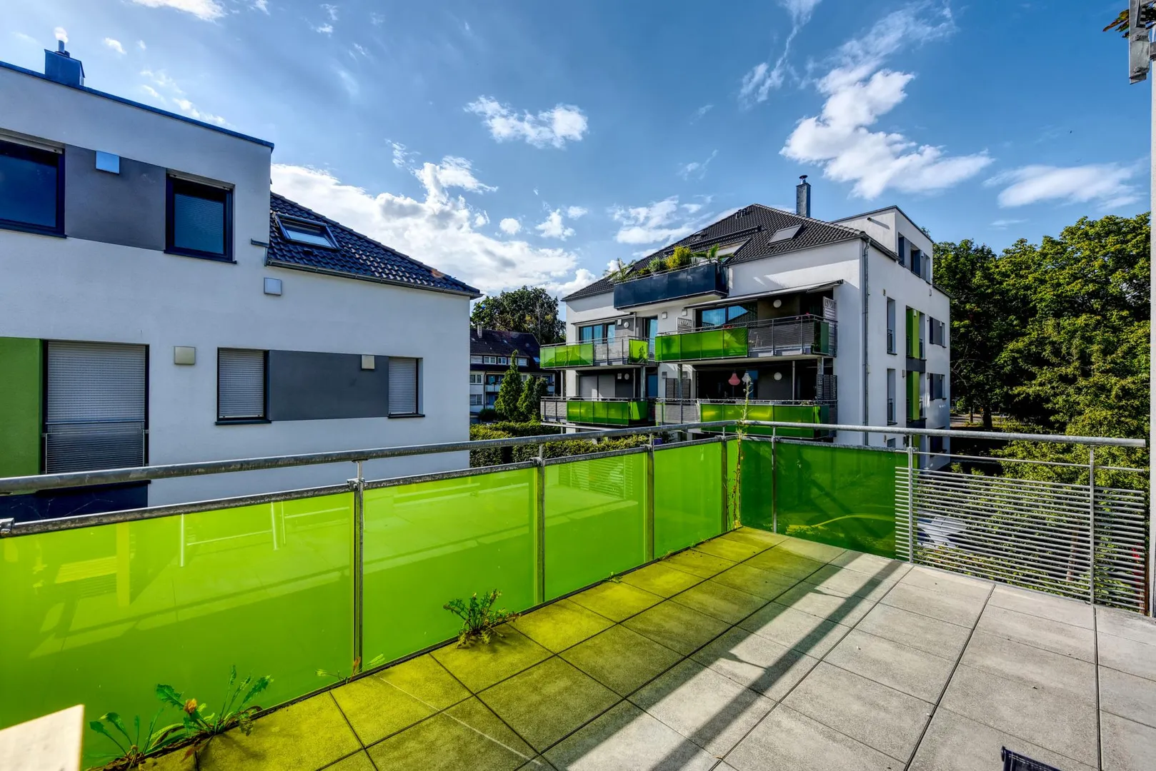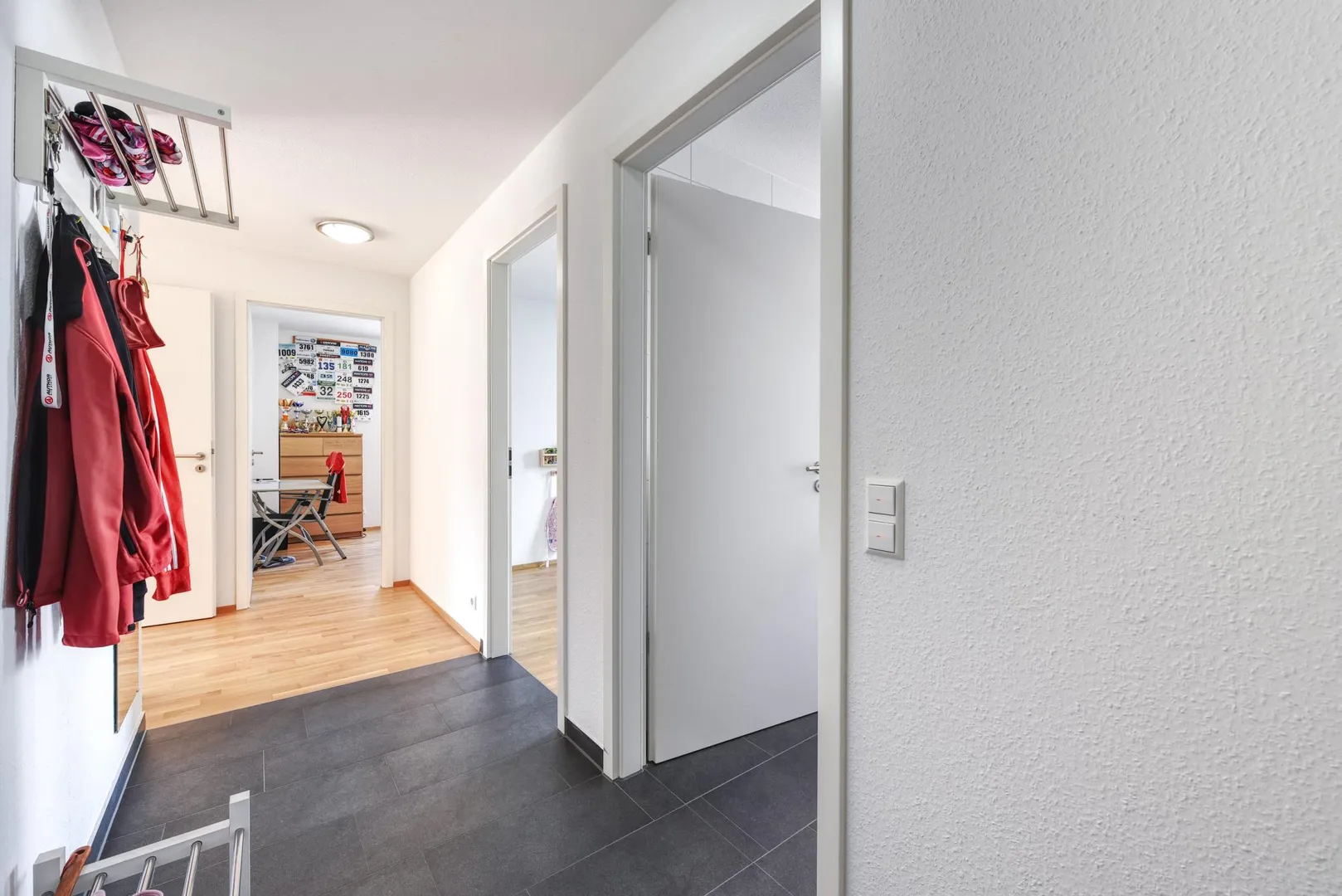 Der Grundriss ist offen gestaltet. Über den offenen Flur sind der offene Wohn-, Ess- und Küchenbereich erreichbar. Das Badezimmer verfügt über ein Fenster. Der ca. 10 m² große West-Balkon ist über den Wohnbereich begehbar. In der Wohnung befindet sich ein Abstellraum. Das Schlafzimmer sowie das Kinderzimmer verfügen über französische Balkone.