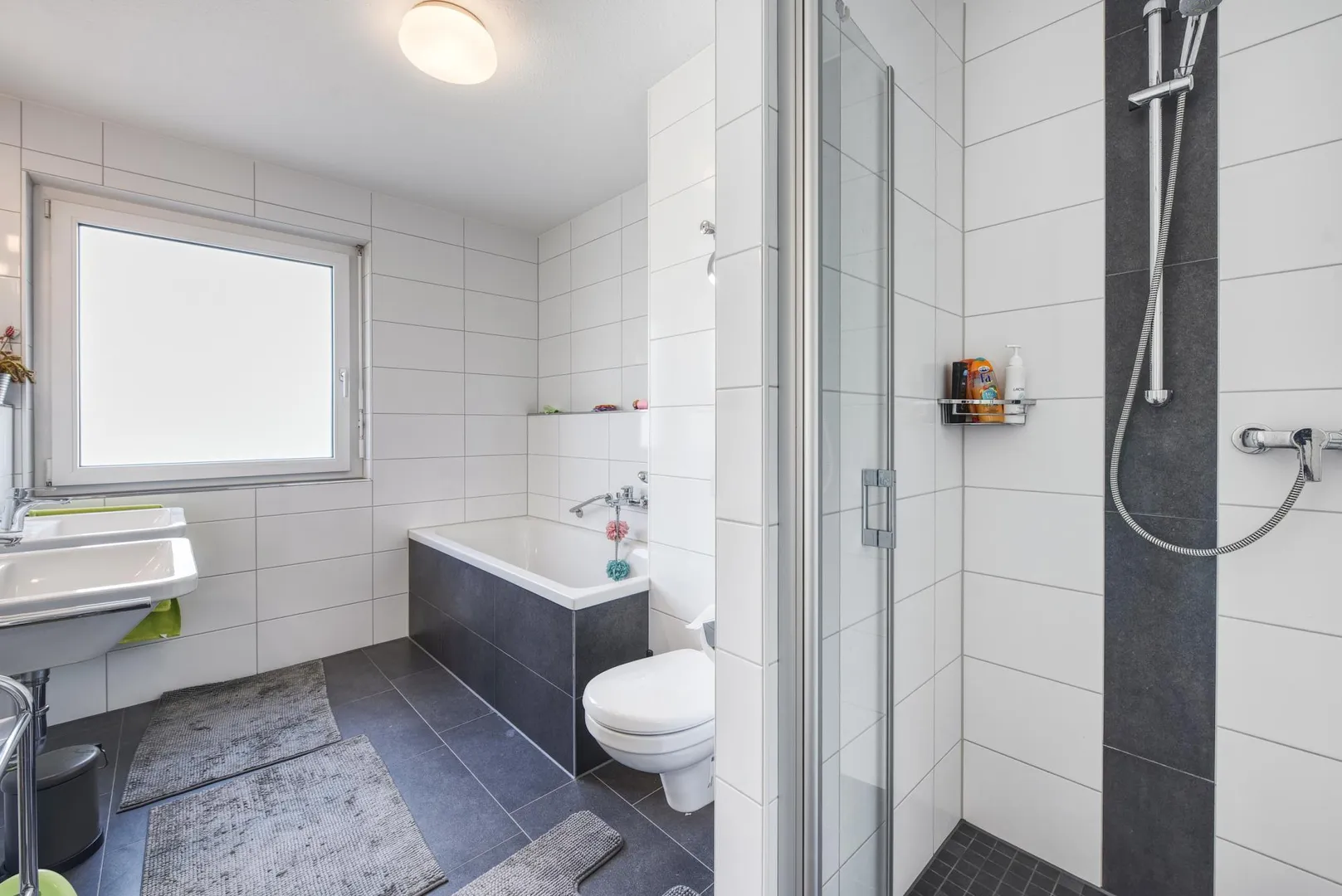 Das raumhoch gefliest Tageslicht-Badezimmer ist ausgestattet mit einem Fliesenboden, einer Badewanne, einer bodentiefen Dusche, einem WC, zwei Waschbecken sowie einem Spiegel mit Beleuchtung.