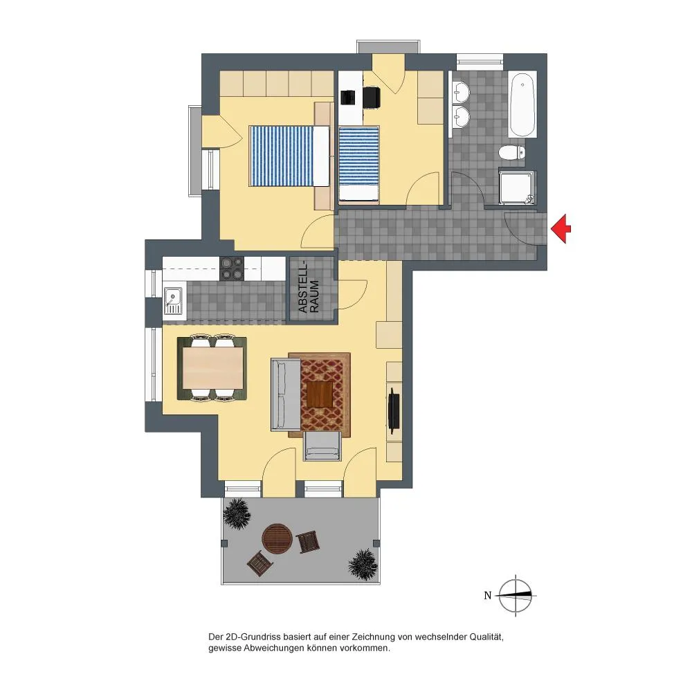 Der Wohnbereich ist nach Westen ausgerichtet. Die Küche sowie das Schlafzimmer sind nach Norden ausgerichtet. Das Kinderzimmer sowie das Bad sind nach Osten ausgerichtet.