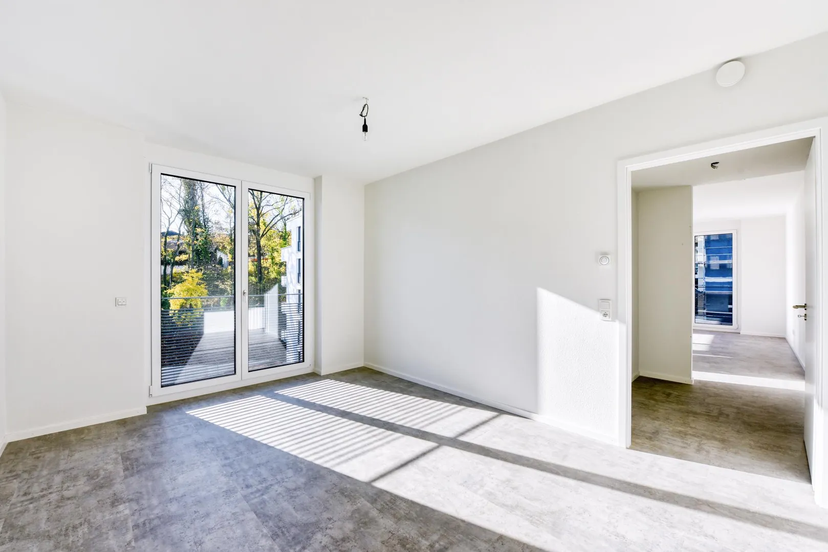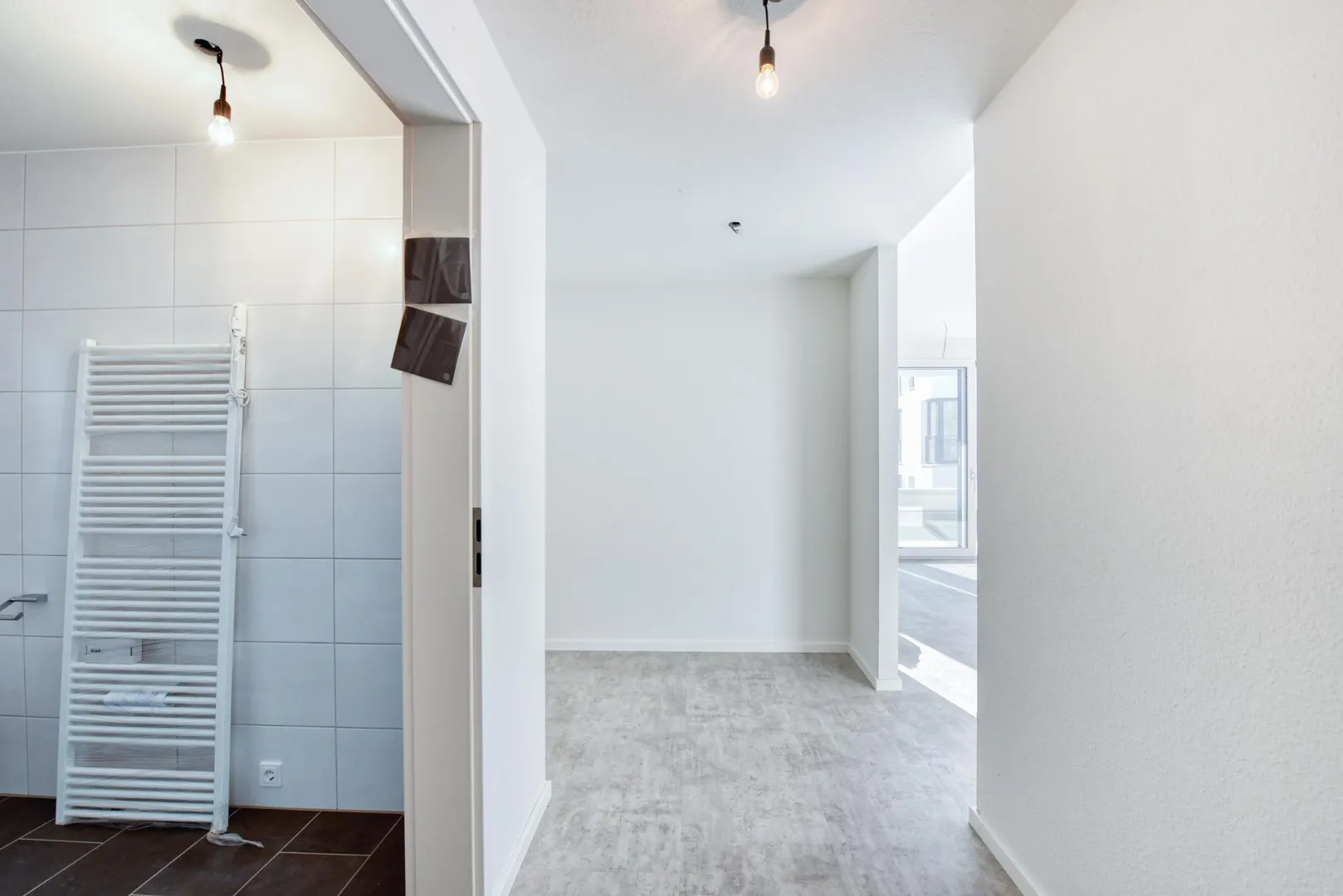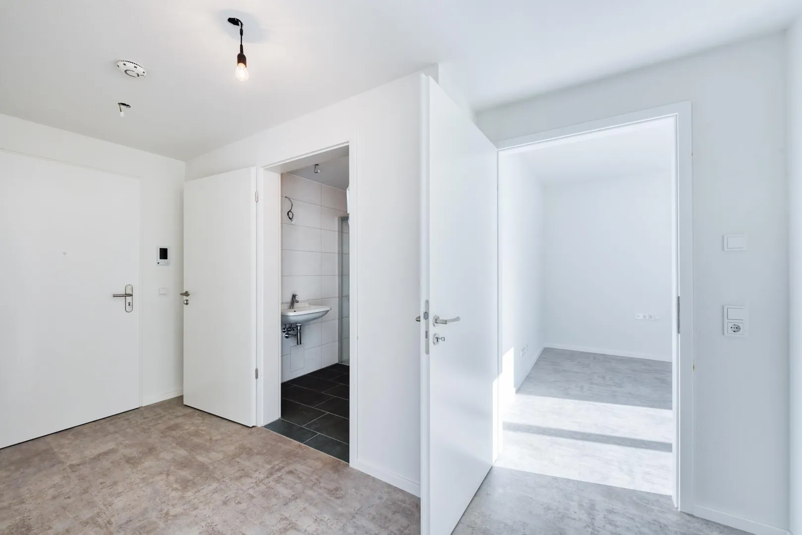 Alle Zimmer und der Flur sind mit hochwertigen Bio-Design-Vinylböden ausgestattet. Die Wände sind mit Raufasertapeten tapeziert und weiß gestrichen.