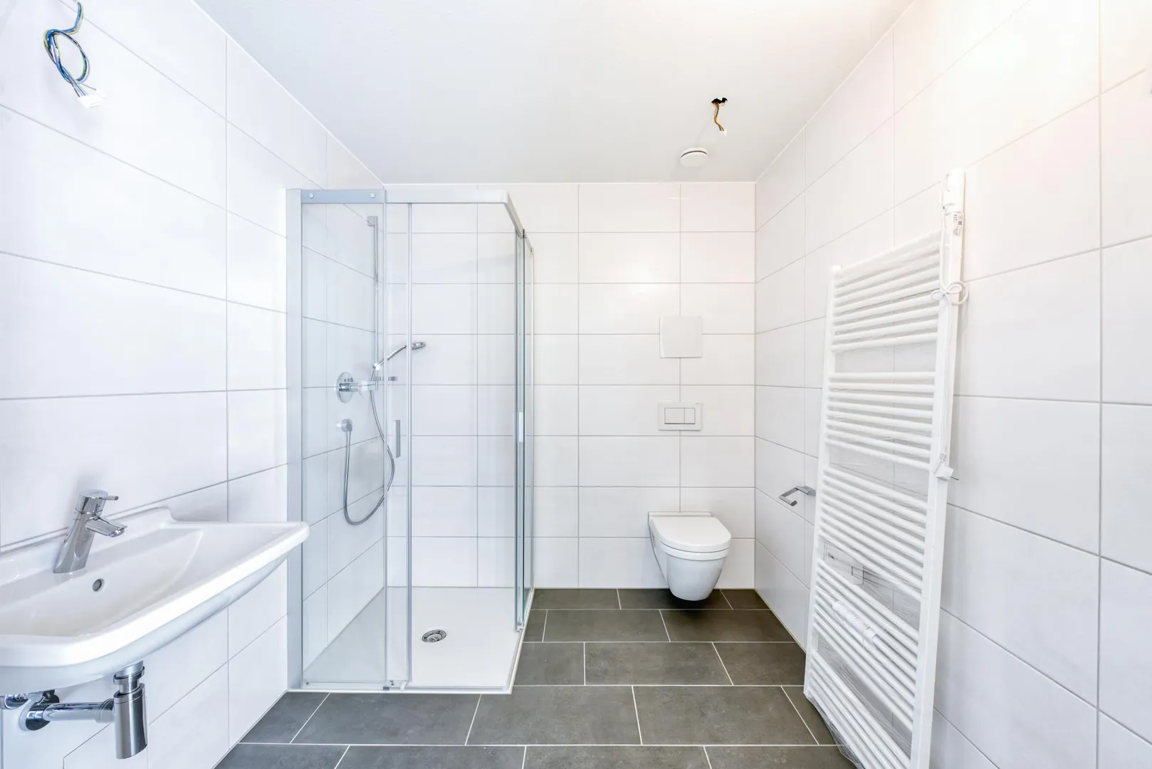 Das raumhoch geflieste Badezimmer ist ausgestattet mit einem Fliesenboden, einer bodentiefen Dusche, einem WC, einem Handtuch-Heizkörper sowie einem Spiegelschrank.