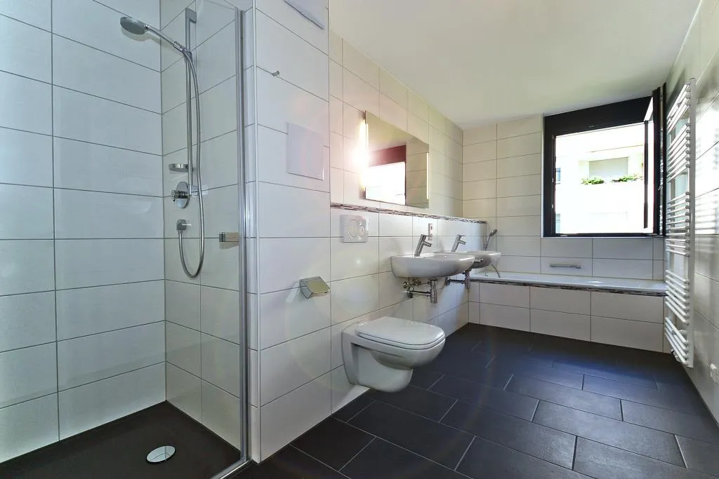 Das Badezimmer mit Fenster ist raumhoch gefliest und ausgestattet mit bodentiefer Dusche, Badewanne, Doppelwaschbecken, Handtuch-Heizkörper sowie WC. Ein zweites WC ist separat und gefliest.
