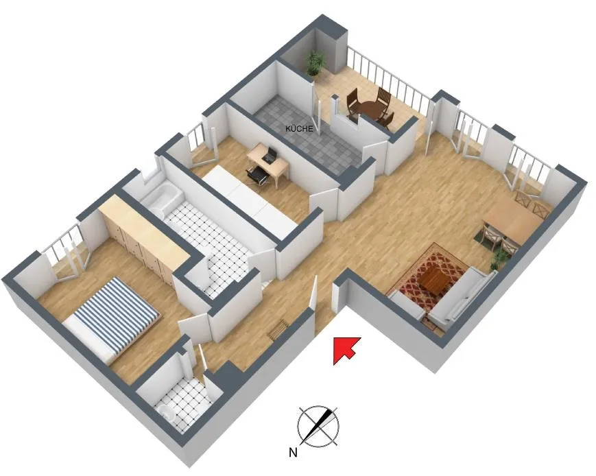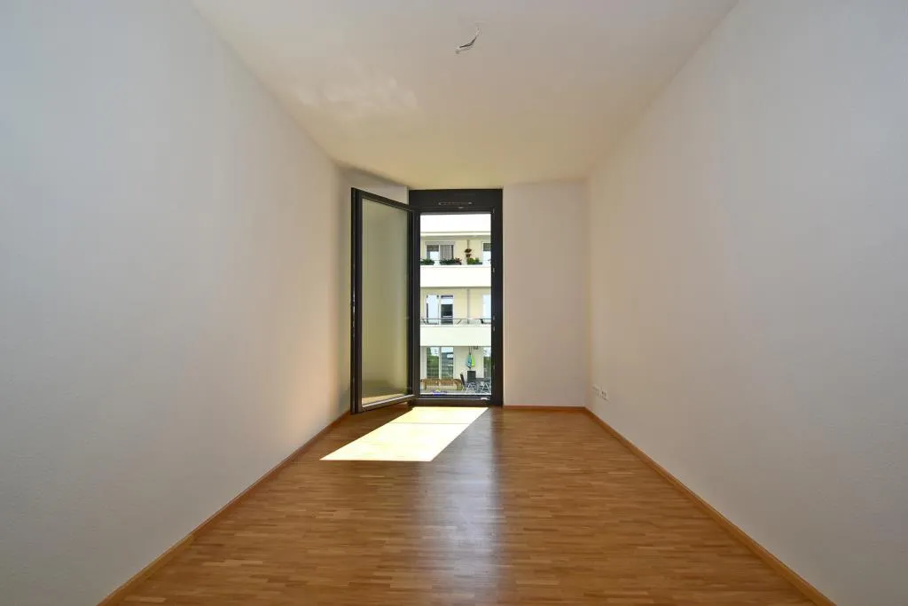 Vom offenen Wohnzimmer und von der Küche ist der ca. 9 m² große und überdachte Süd-Balkon begehbar. Das Wohnzimmer verfügt zusätzlich über zwei französische Balkone.