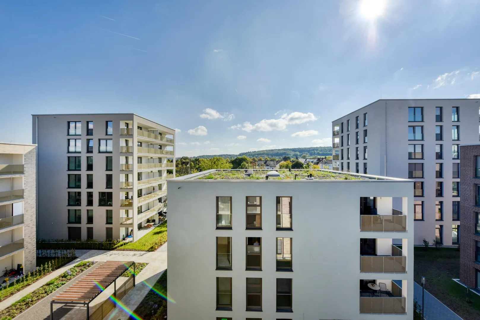 Es ist ausgestattet mit Vollwärmeschutz, Fernwärme-Fußboden-Zentralheizung, 3-fach verglasten Kunststofffenstern mit elektrischen Rollläden, barrierefreien Zugang, Aufzug, Tiefgarage sowie Glasfaseranschluss.