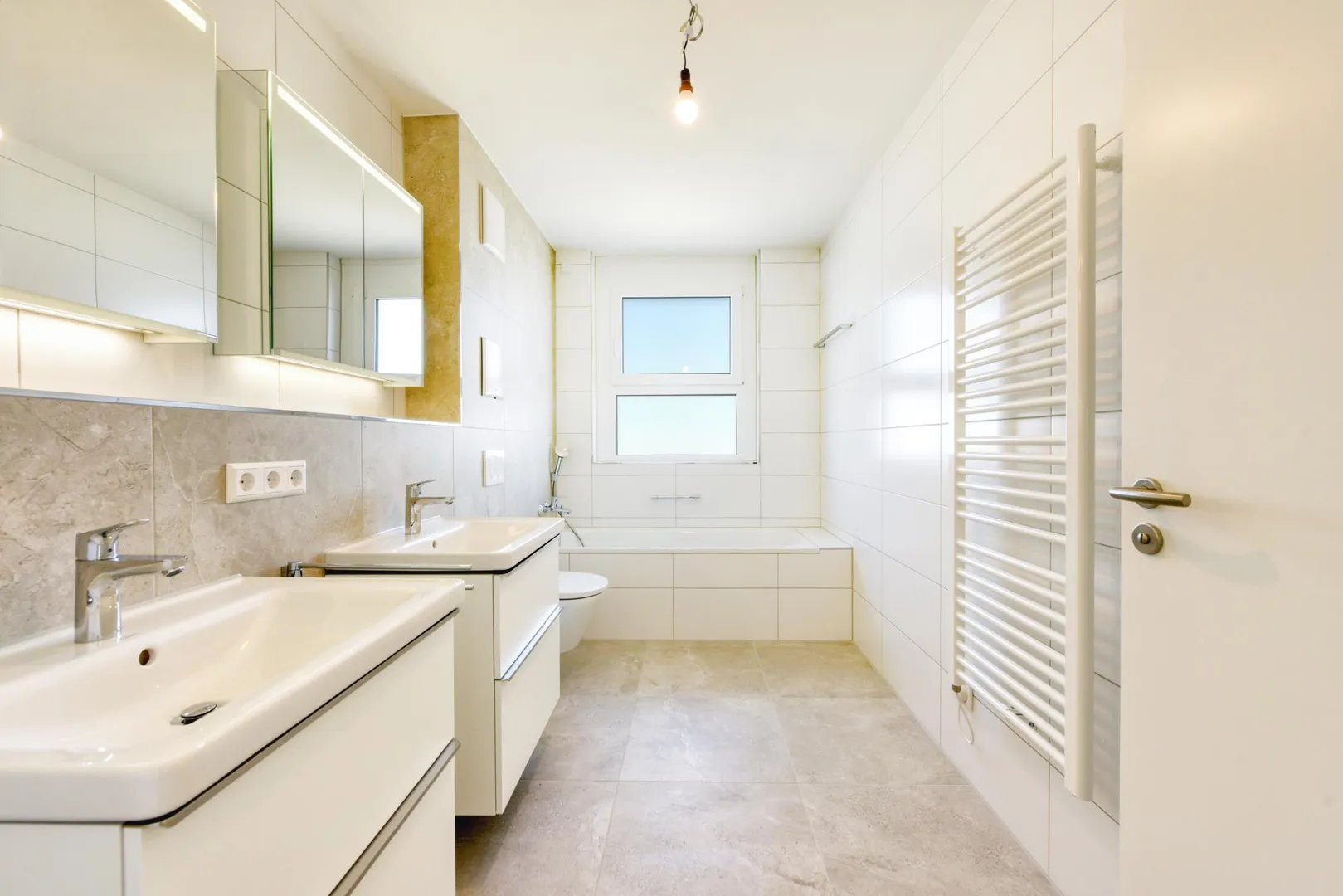 Das große, raumhoch geflieste Tageslicht-Badezimmer ist ausgestattet mit einer Badewanne, zwei Waschbecken, einem WC, einem Handtuch-Heizkörper, zwei belichteten Spiegelschränken sowie zwei Waschtisch-Unterschränken.