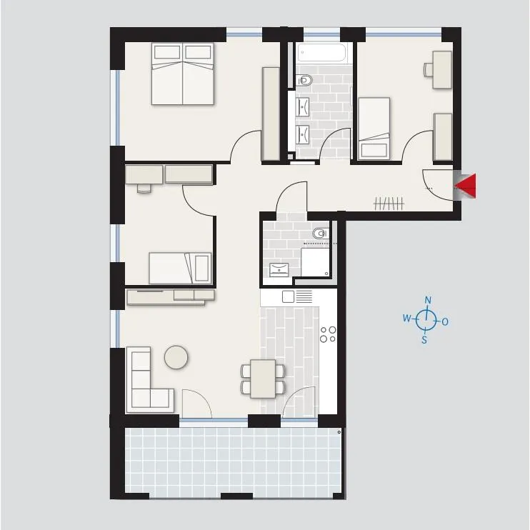 Der Grundriss ist offen gestaltet: der Flur-/Wohn-/Ess- sowie Küchenbereich ist offen. Das große Badezimmer verfügt über ein Fenster sowie ein WC. Das zweite Badezimmer ist innenliegen und verfügt ebenfalls über ein WC. Der ca. 15 m² große und überdachte Balkon ist über den Wohnbereich begehbar.