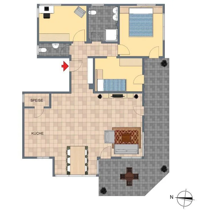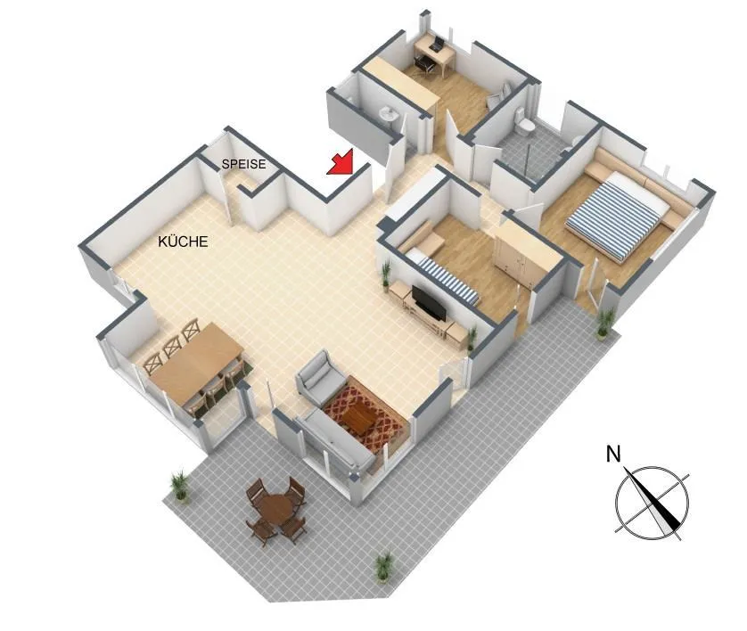 Die ca. 34 m² große und nach Süd-Westen ausgerichtete Terrasse ist vom Wohnbereich begehbar.